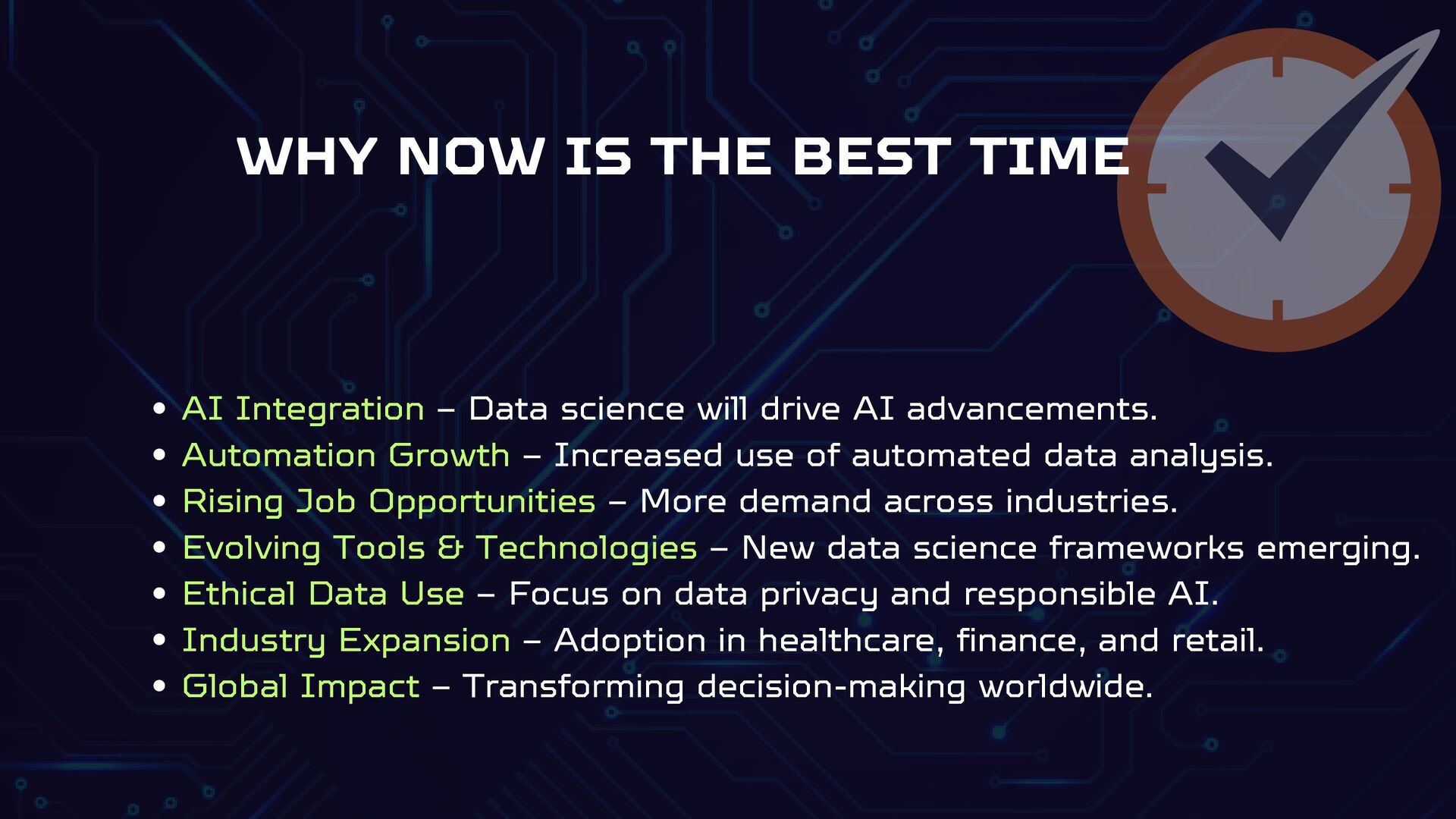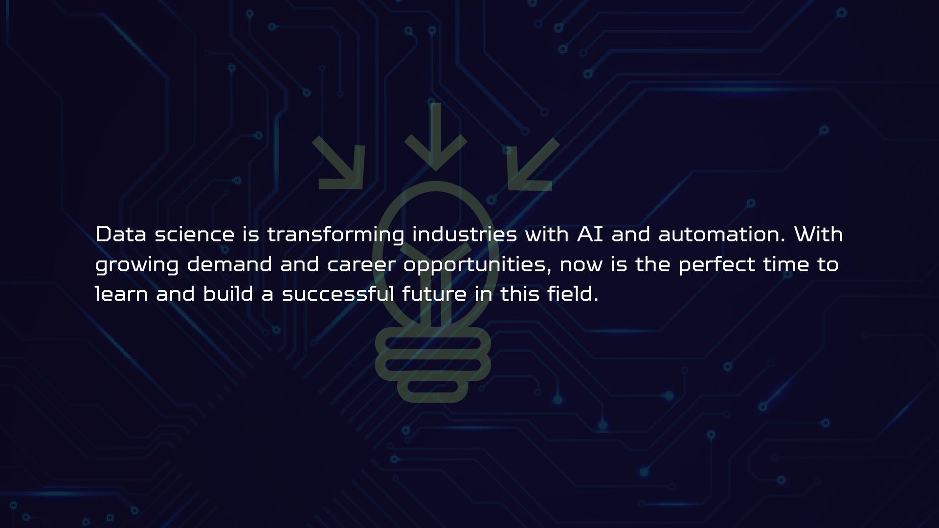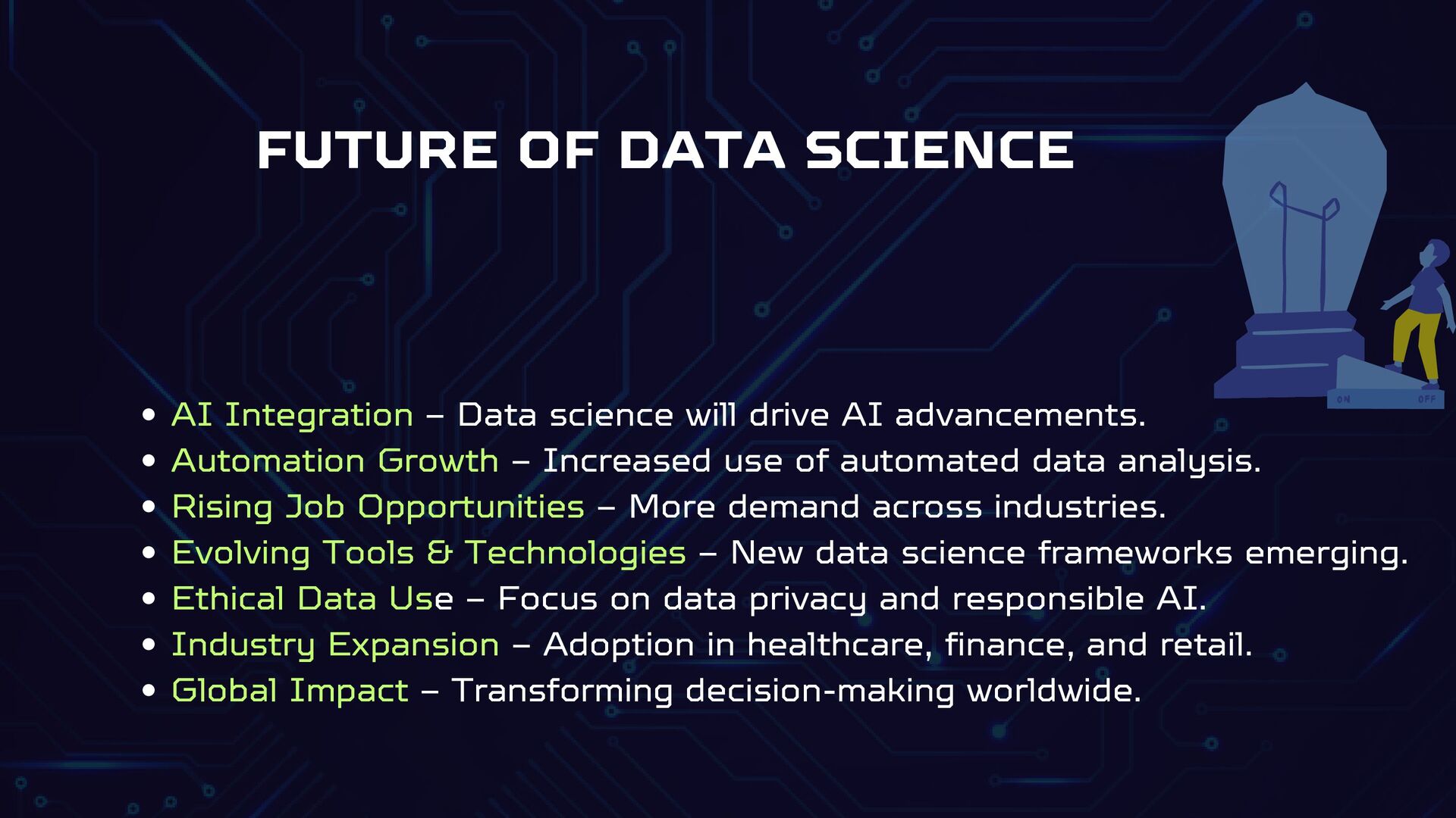 science will drive AI advancements. Automation Growth – Increased use of automated data analysis. Rising Job Opportunities – More demand across industries. Evolving Tools & Technologies – New data science frameworks emerging. Ethical Data Use – Focus on data privacy and responsible AI. Industry Expansion – Adoption in healthcare, finance, and retail. Global Impact – Transforming decision-making worldwide.
