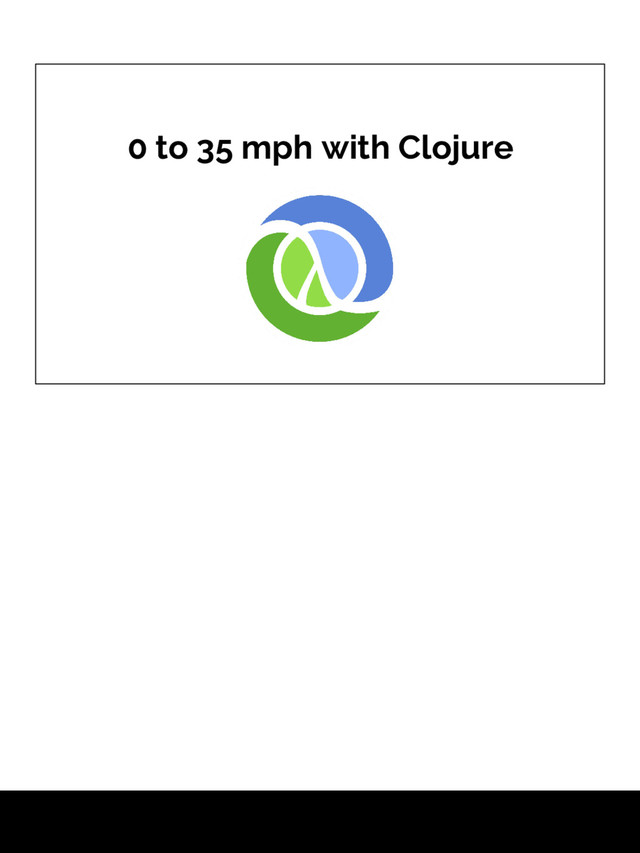 Ruby ◦ Ruby - 3’ish years ◦ Clojure - 1 year • Focus on domain problem rather than language • Productivity gains on server (relative to Ruby) • Huge productivity gains on client (relative to JavaScript) • Attribute to ◦ Being a more experienced developer ◦ Less magic in Clojure (than Ruby) ▪ What’s happening in an application is more transparent ◦ Minimal syntax ▪ Apart from parenthesis ▪ Managed by ide/text-editor ◦ Immutability ▪ Again, I found that a lot of complexity derives from maintaining state ▪ The less amount of state you manage, the less complexity ▪ This is provided to you b/c data structures are immutable • It makes it difficult to maintain state • State that is maintained ◦ Has a very explicit scope and small surface area ◦ Or is pushed outside the application all together ▪ The db ◦ Language simplicity/terseness ▪ Less noise ▪ No class constructors