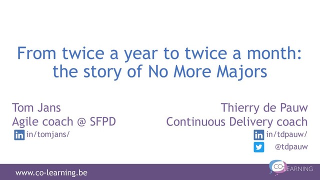 First thing on the list: getting rid of bi-quarterly major releases, instead of releasing all functionalities in biweekly increments. This was something that had been talked about for a long time, but never really attempted. So a community of practice was kickstarted, with the ambitious goal of finally making this dream a reality in just a few months.