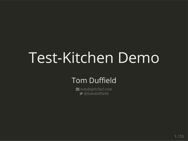 gems. $ g e m i n s t a l l t e s t - k i t c h e n Once the gem is installed, initialize a working directly. This can either be a chef-repo, a cookbook, or any other directory. $ k i t c h e n i n i t c r e a t e . k i t c h e n . y m l c r e a t e t e s t / i n t e g r a t i o n / d e f a u l t r u n g e m i n s t a l l k i t c h e n - v a g r a n t f r o m " . " S u c c e s s f u l l y i n s t a l l e d k i t c h e n - v a g r a n t - 0 . 1 4 . 0 1 g e m i n s t a l l e d The output of this initialization command is: a configuration template (. k i t c h e n . y m l ) a skeletal framework for tests (t e s t / i n t e g r a t i o n / d e f a u l t ) the installation of the default Driver (k i t c h e n - v a g r a n t ) 17 / 25