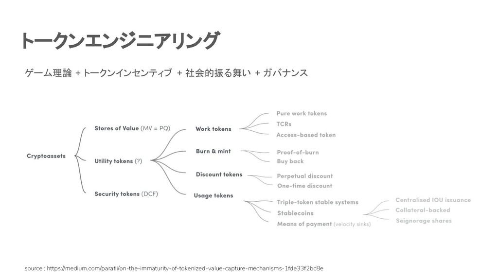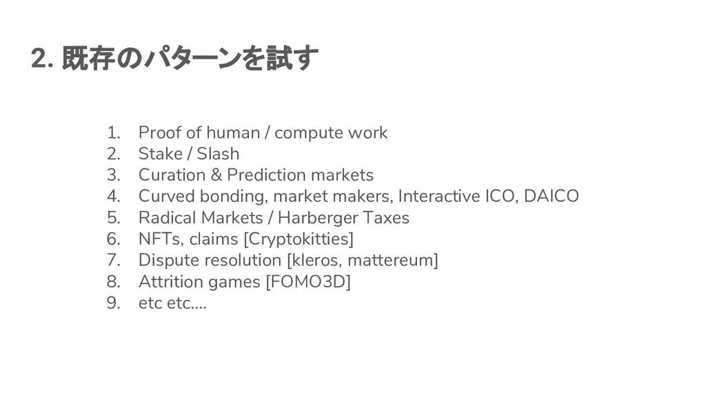 Stake / Slash 3. Curation & Prediction markets 4. Curved bonding, market makers, Interactive ICO, DAICO 5. Radical Markets / Harberger Taxes 6. NFTs, claims [Cryptokitties] 7. Dispute resolution [kleros, mattereum] 8. Attrition games [FOMO3D] 9. etc etc….