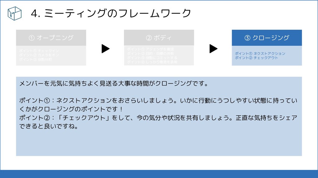 ミーティングのフレームワーク ② ボディ ③ クロージング ポイント① チェックイン ポイント② カメラをオン ポイント③ 役割分担 ポイント① アジェンダを確認 ポイント② 目的・目標の共有 ポイント③ 役割にコミットする ポイント④ しっかり意思を表明 ポイント① ネクストアクション ポイント② チェックアウト ▶ ▶