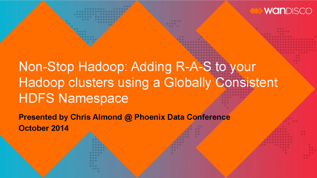 Today Who am I and what is this about? At Work: [email protected] On line: www.linkedin.com/in/chrisalmond/ www.twitter.com/calmo Session Description: Hadoop has quickly evolved into the system of choice for storing and processing Big Data, and is now widely used to support mission- critical applications that operate within a ‘data lake’ style infrastructures. A critical requirement of such applications is the need for continuous operation even in the event of various system failures. This requirement has driven adoption of multi-data center Hadoop architectures, a.k.a geo-distributed or global Hadoop. In this session we will provide a brief introduction to WANdisco, then dig into how our Non-Stop Hadoop solution addresses real world use cases, and also a show live demonstration of Non-Stop namenode operation across two WAN connected hadoop clusters.