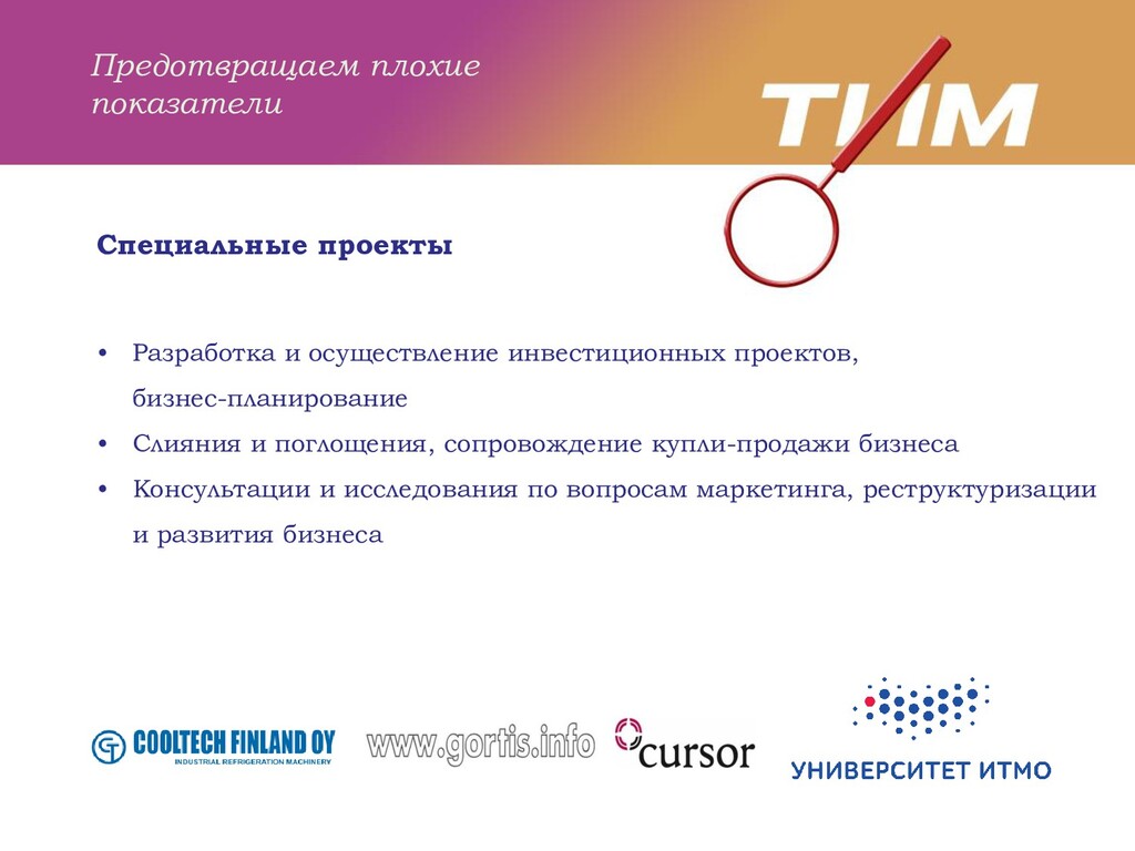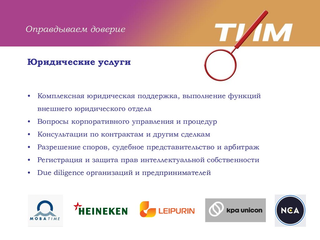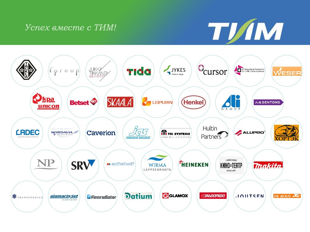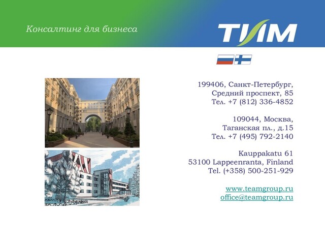 консультационных услуг 1992 – в Архангельске основана Юридическая фирма «ТИМ» 1995 – открыто юридическое бюро «ТИМ Петербург» 2003 – заключен первый договор на бухгалтерское обслуживание 2004 – создание ООО «Консультационная группа ТИМ» 2012 – 20-летний юбилей компании; в состав акционеров компании вошли финские партнеры, ТИМ приобрел международный статус 2015 – зарегистрирован товарный знак «ТИМ» 2018 – ТИМ, его клиенты и партнеры принимают участие в крупных проектах приуроченных к Чемпионату Мира по футболу 2019 – «Новая История» ТИМ: переезд в новый офис на Среднем проспекте, 85 2020 – ТИМ и его клиенты пережили коронавирус и собрались на День Друзей