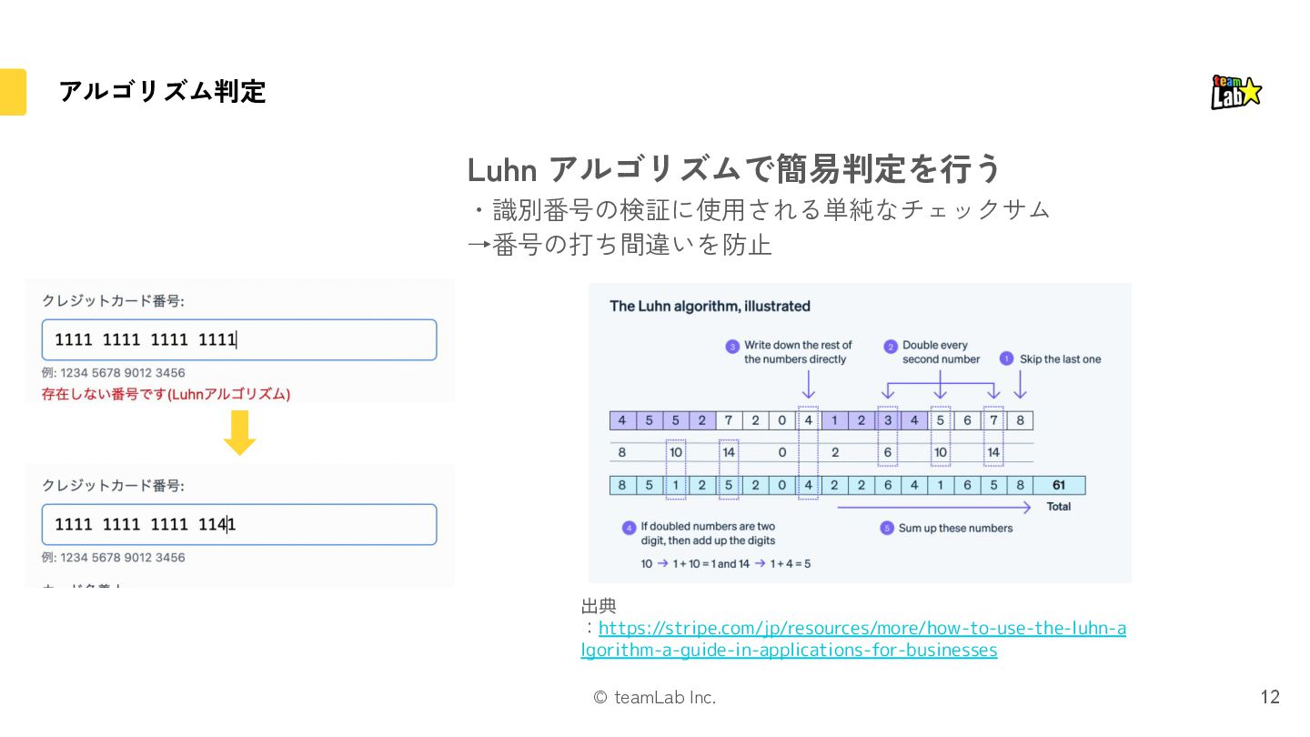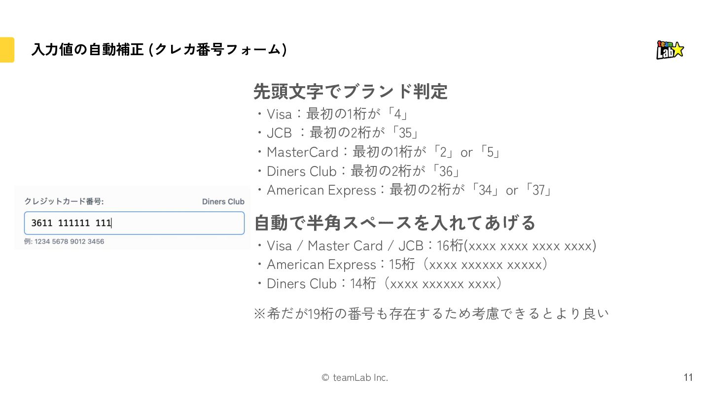 6. © teamLab Inc. 先頭文字でブランド判定 ・Visa:最初の1桁が「4」 ・JCB :最初の2桁が「35」 ・MasterCard:最初の1桁が「2」or「5」 ・Diners Club:最初の2桁が「36」