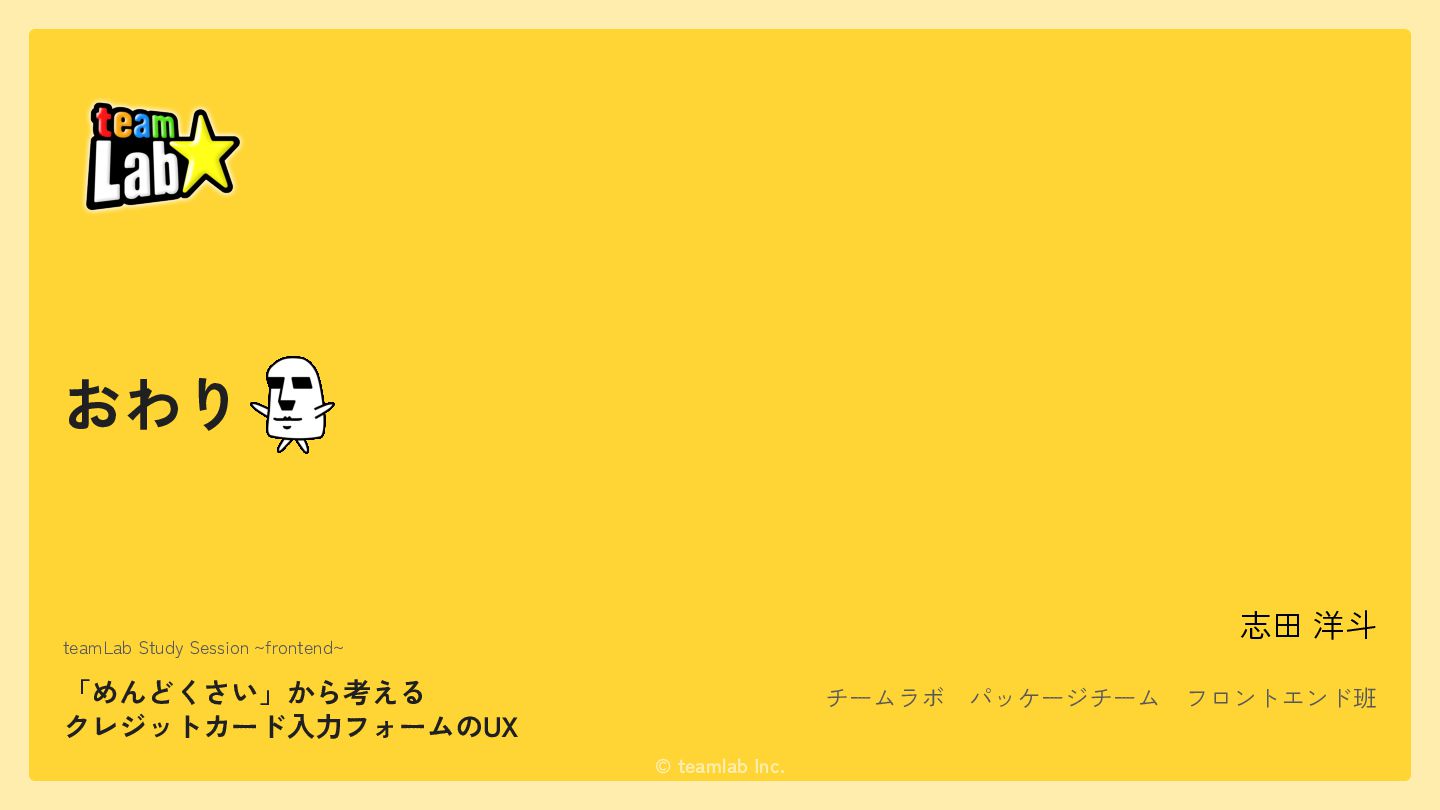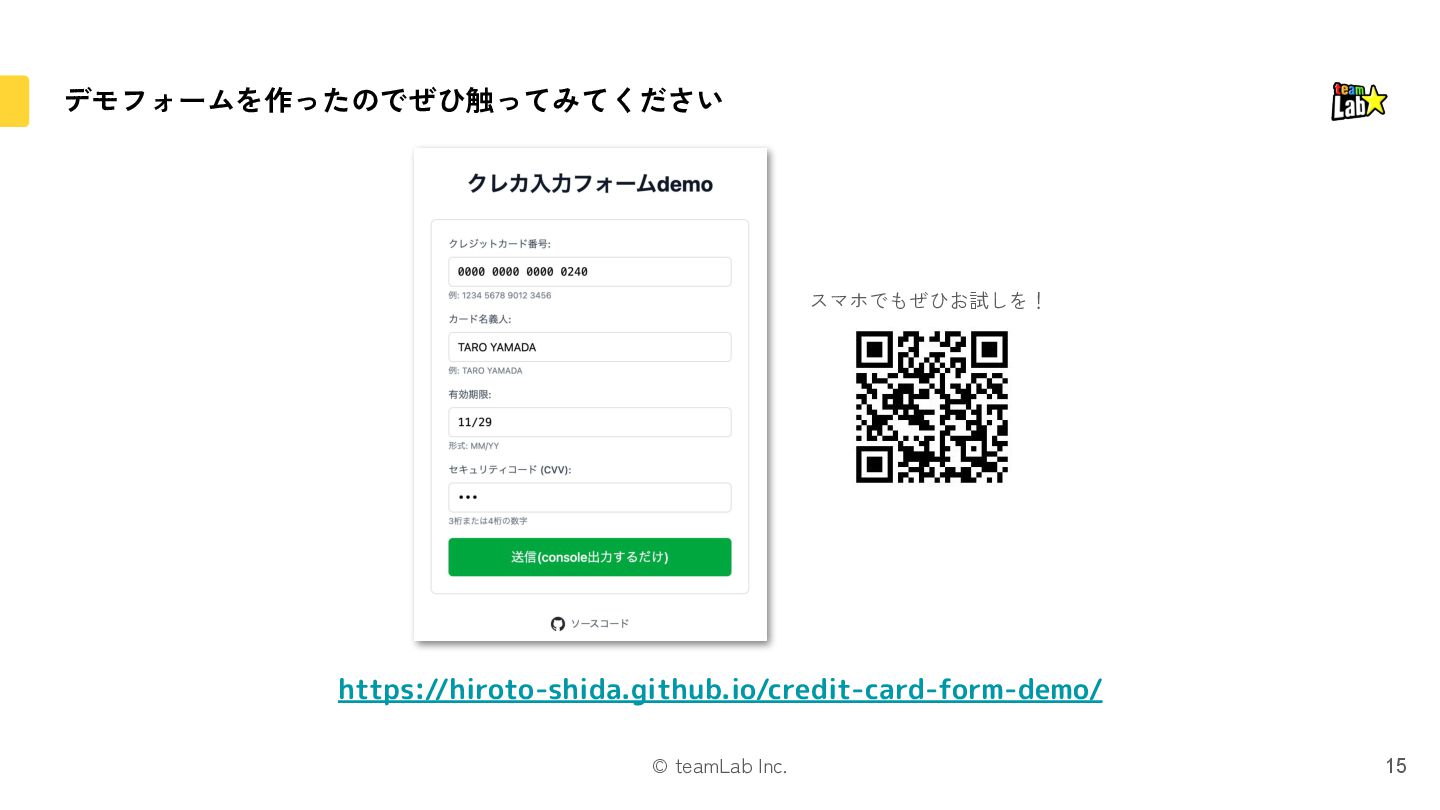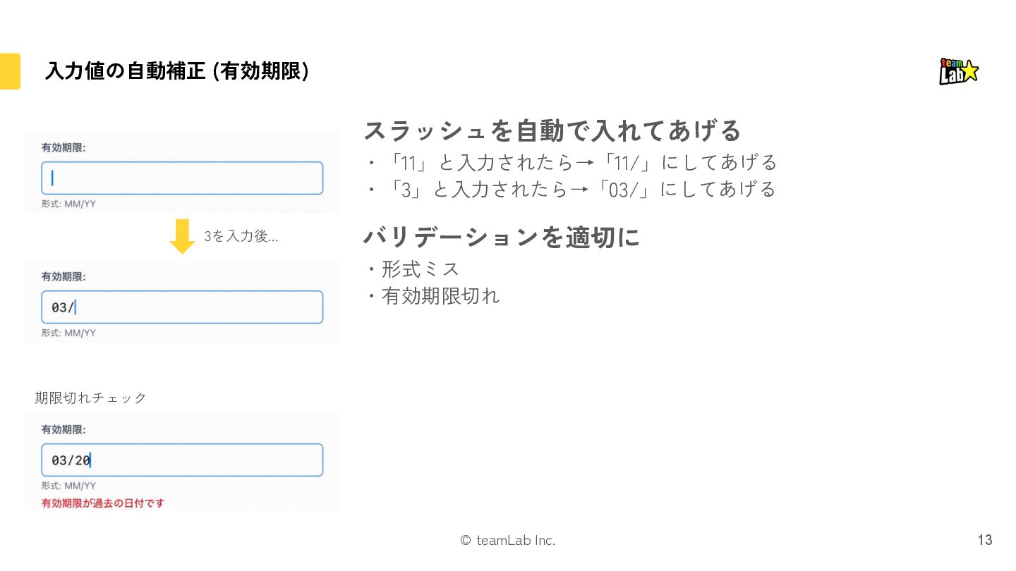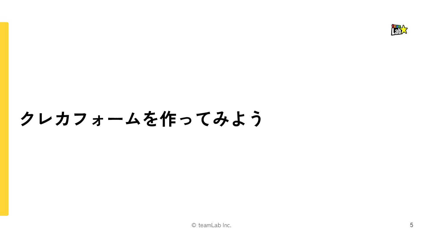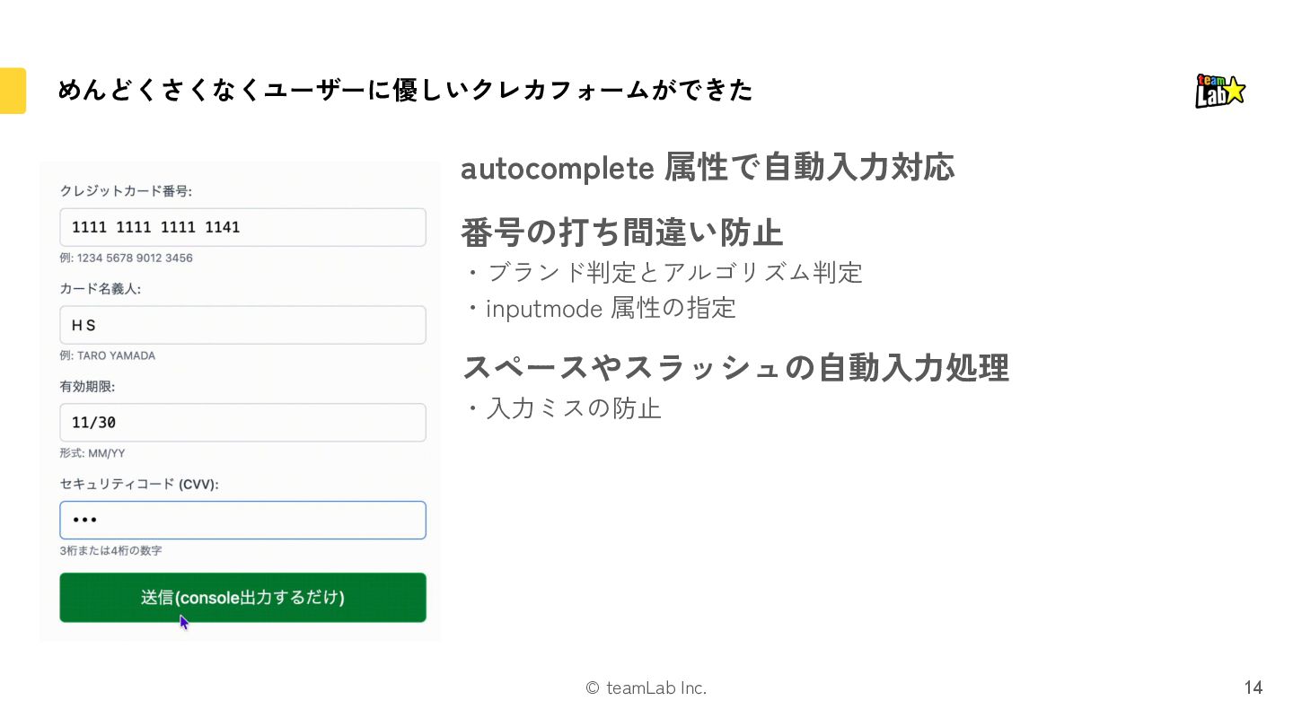 4. © teamLab Inc. クレカ入力に役立つ autocomplete 属性 ・cc-number:クレジットカードや番号や口座番号 ・cc-name:クレジットカードなどの支払手段、または関連付けられた氏名 ・cc-exp:  支払手段の有効期限(