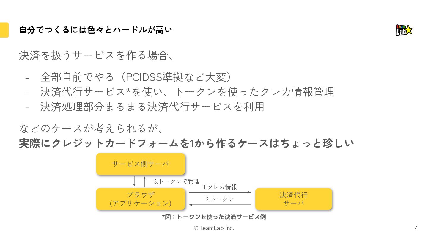 2. © teamLab Inc. 決済を扱うサービスを作る場合、 - 全部自前でやる(PCIDSS準拠など大変) - 決済代行サービス*を使い、トークンを使ったクレカ情報管理 - 決済処理部分まるまる決済代行サービスを利用