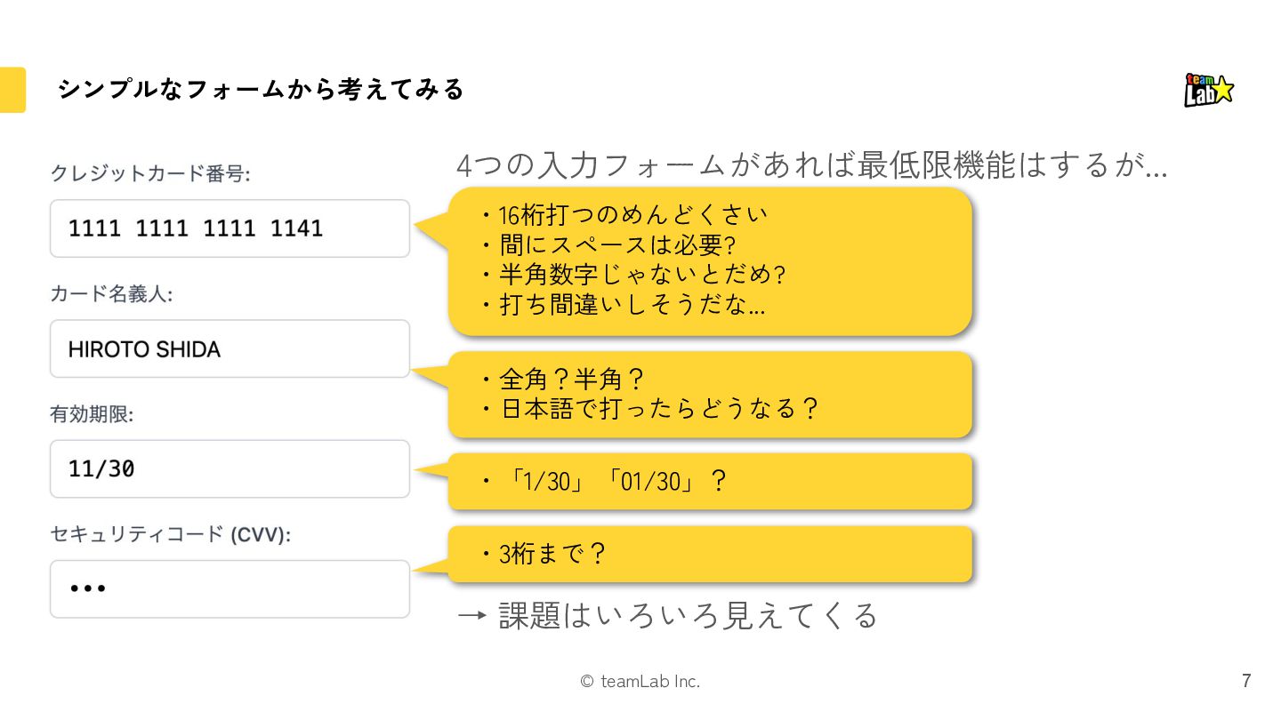 3. © teamLab Inc. 4つの入力フォームがあれば最低限機能はするが... → 課題はいろいろ見えてくる シンプルなフォームから考えてみる 7 ・16桁打つのめんどくさい ・間にスペースは必要?