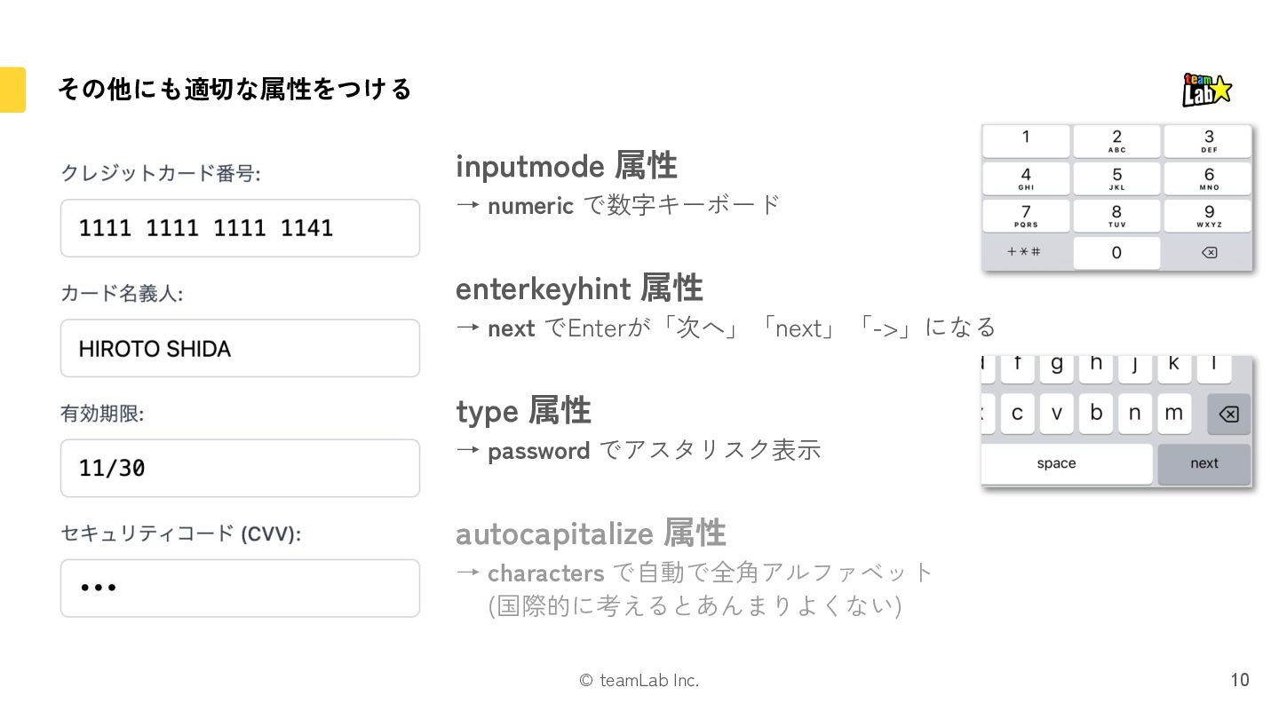 → next でEnterが「次へ」「next」「->」になる type 属性 → password でアスタリスク表示 autocapitalize 属性 → characters で自動で全角アルファベット   (国際的に考えるとあんまりよくない) その他にも適切な属性をつける 10