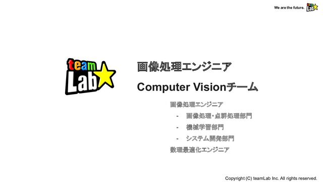 reserved. チームラボの画像処理エンジニアの特徴 仕様検討 作品として 面白さのすり合わせ ▶検討からスタート ・技術的に可能かどうか ・センサーの種類 ・アルゴリズム開発 実際の展示設営に 携わる ▶オフィス作業 ばかりではない ・検証空間でデータ収集 ・センサーの物理的な 角度調整 ・国内外の展示案件 を経験できる アウトプットが 分かりやすい ▶大規模な展示案件 に関わる ・自分が作った作品への 達成感 ・リリースされると 感慨深い ・お客様のリアクション をSNSで直接確認 仕様検討 Copyright (C) teamLab Inc. All rights reserved. 仕様検討 空間・機材設計 仕様検討 検証 展示現場設営 仕様検討 リリース 自然界に存在しない 環境・課題 ▶特殊な空間・対象 ・プロジェクションで 照らされた空間 ・全面ミラーの空間 ▶センシングに 適した空間設計 ・空間設計や素材の選定