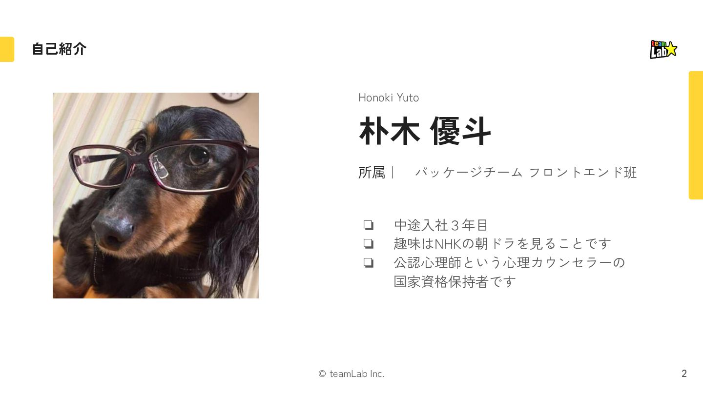 1. © teamLab Inc. 所属| 2 自己紹介 2 パッケージチーム フロントエンド班 朴木