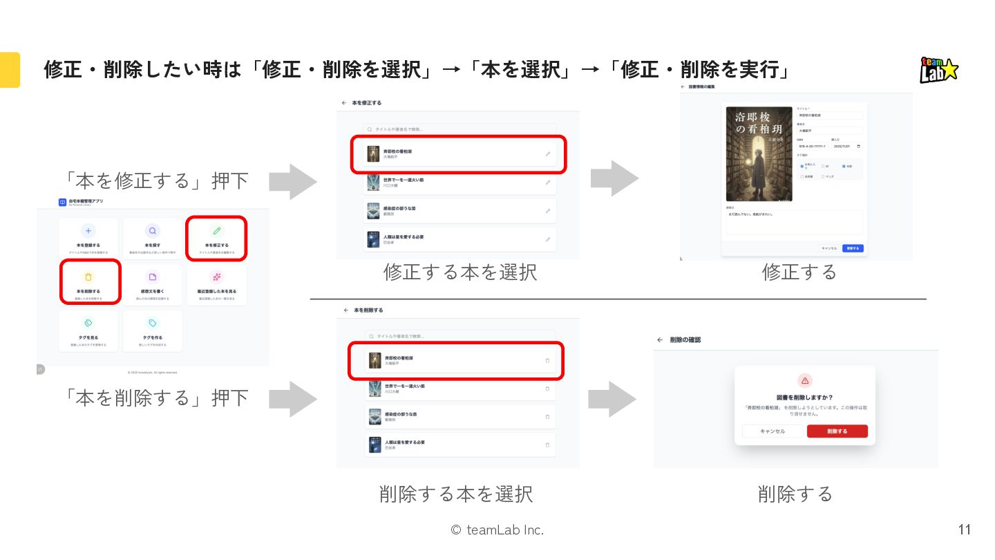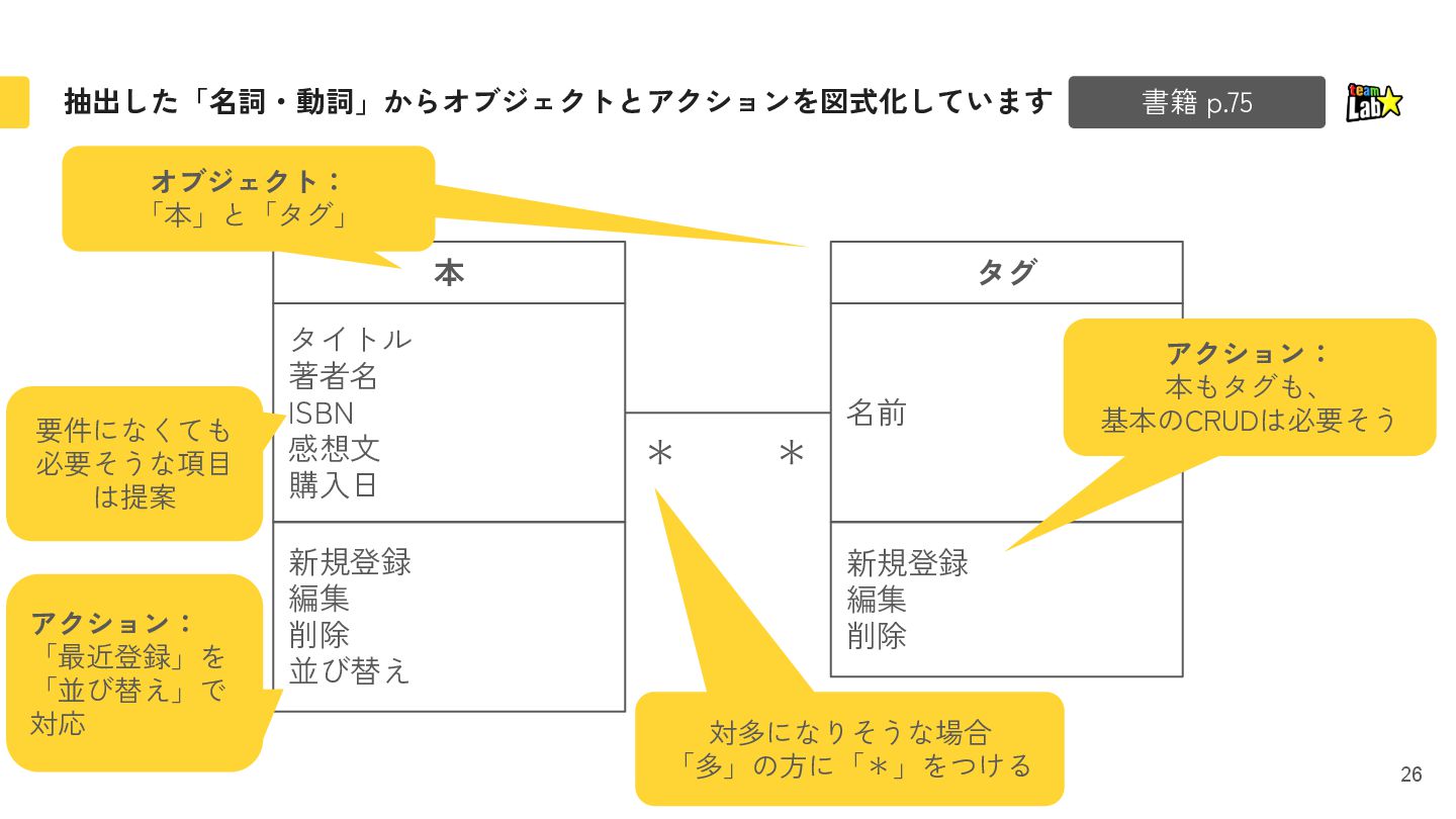 10. © teamLab Inc. 抽出した「名詞・動詞」からオブジェクトとアクションを図式化しています 26 書籍 p.75 新規登録 編集 削除