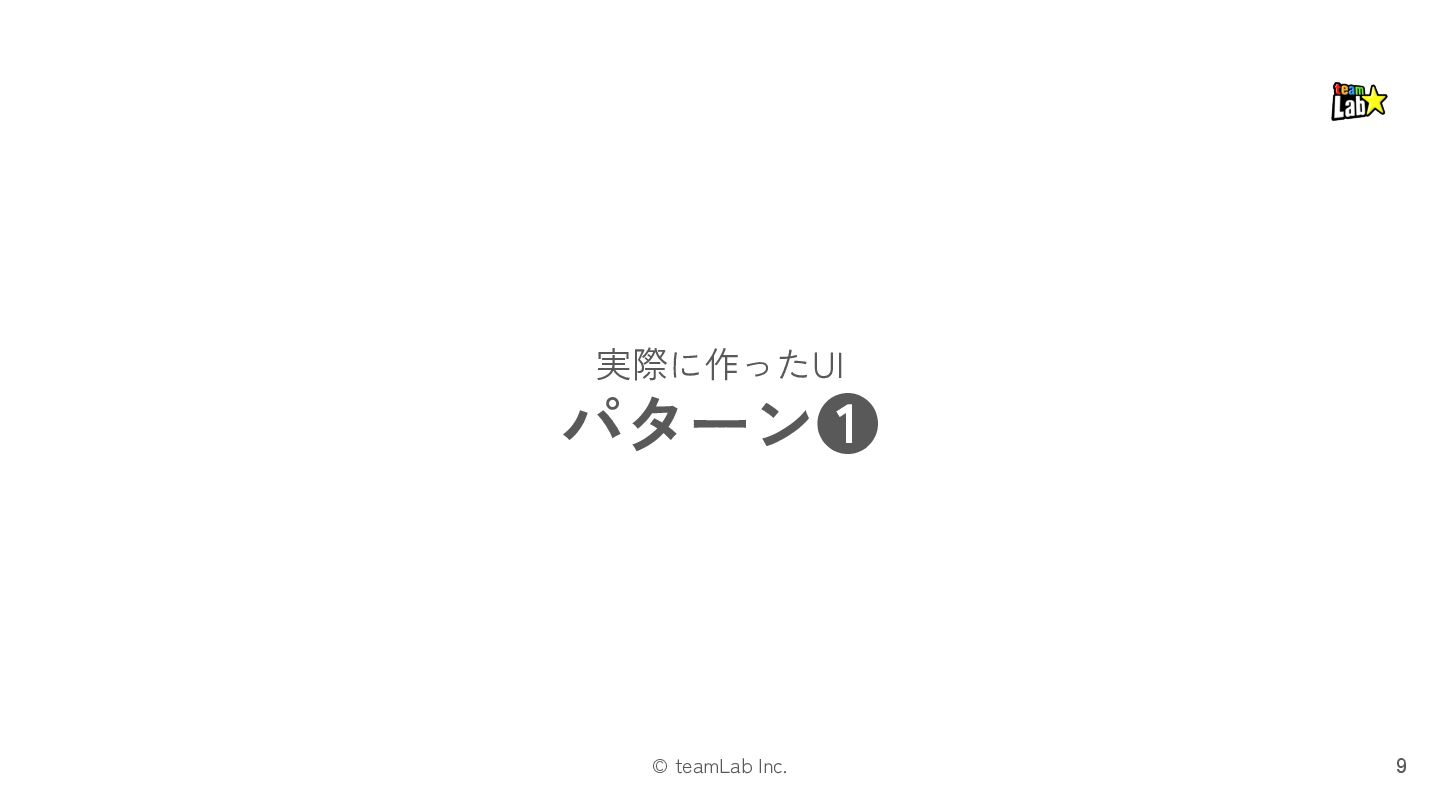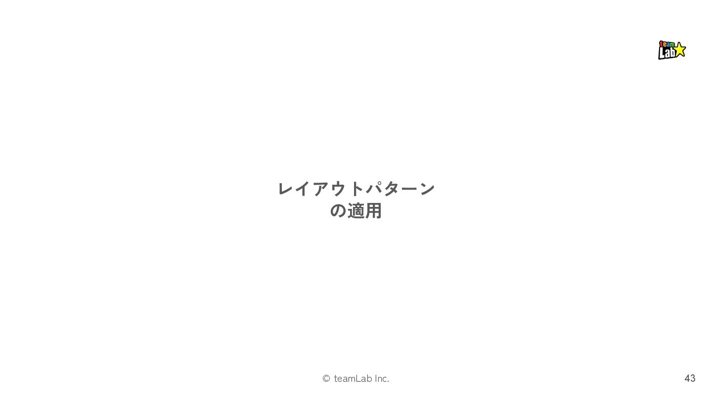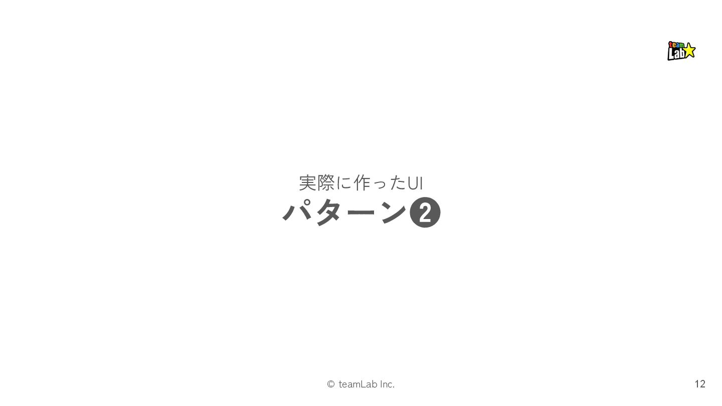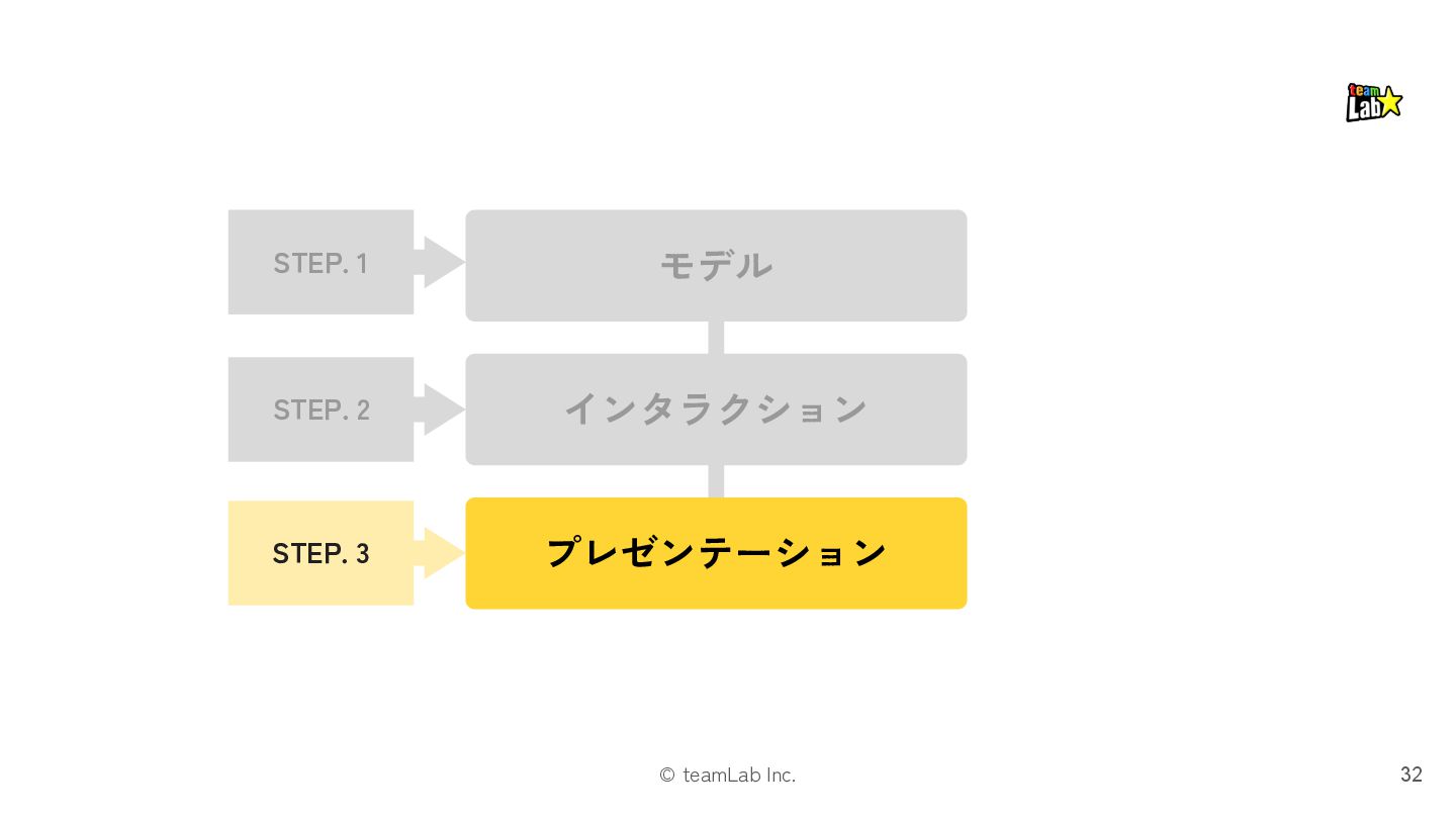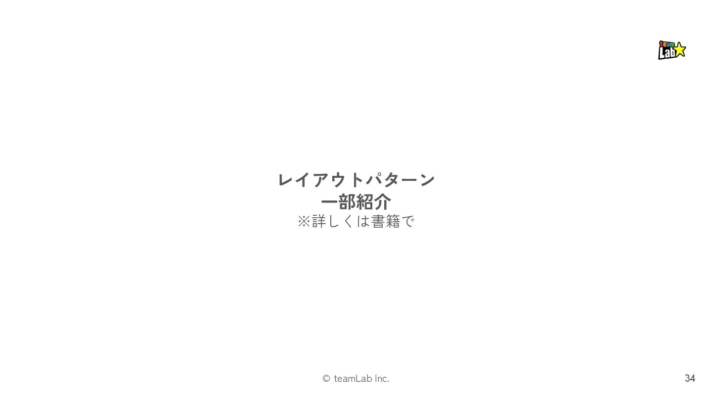 13. © teamLab Inc. STEP.3 「プレゼンテーション」では、レイアウトパターンを適用します 33 ❏ プレゼンテーションは、「インタラクション」の メカニズムを様々なUI表現でユーザーに示すものです ❏