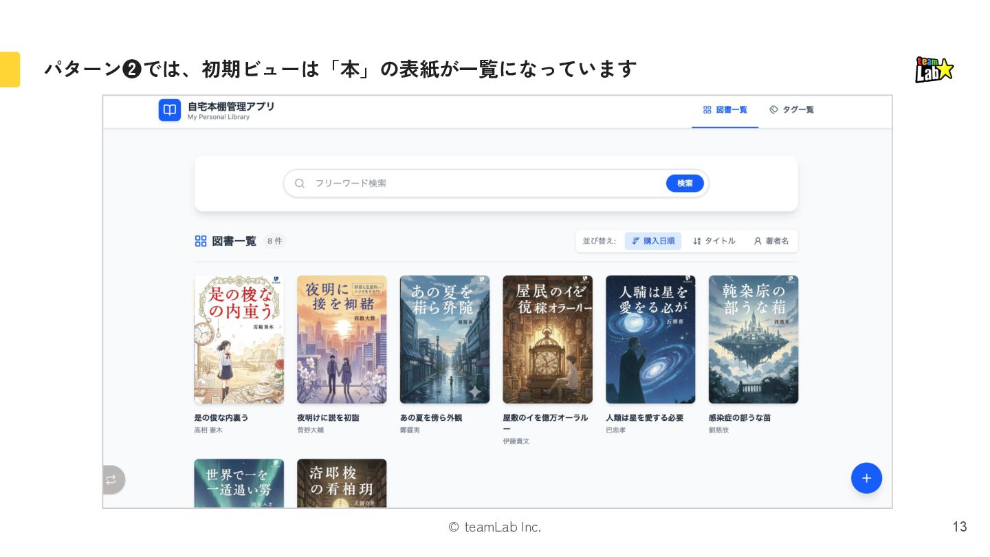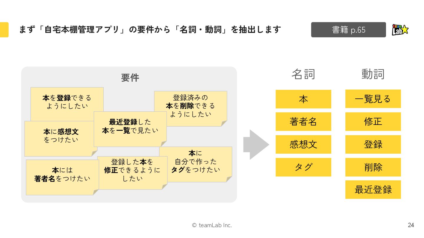8. © teamLab Inc. まず「自宅本棚管理アプリ」の要件から「名詞・動詞」を抽出します 24 書籍 p.65 本を登録できる ようにしたい 登録済みの