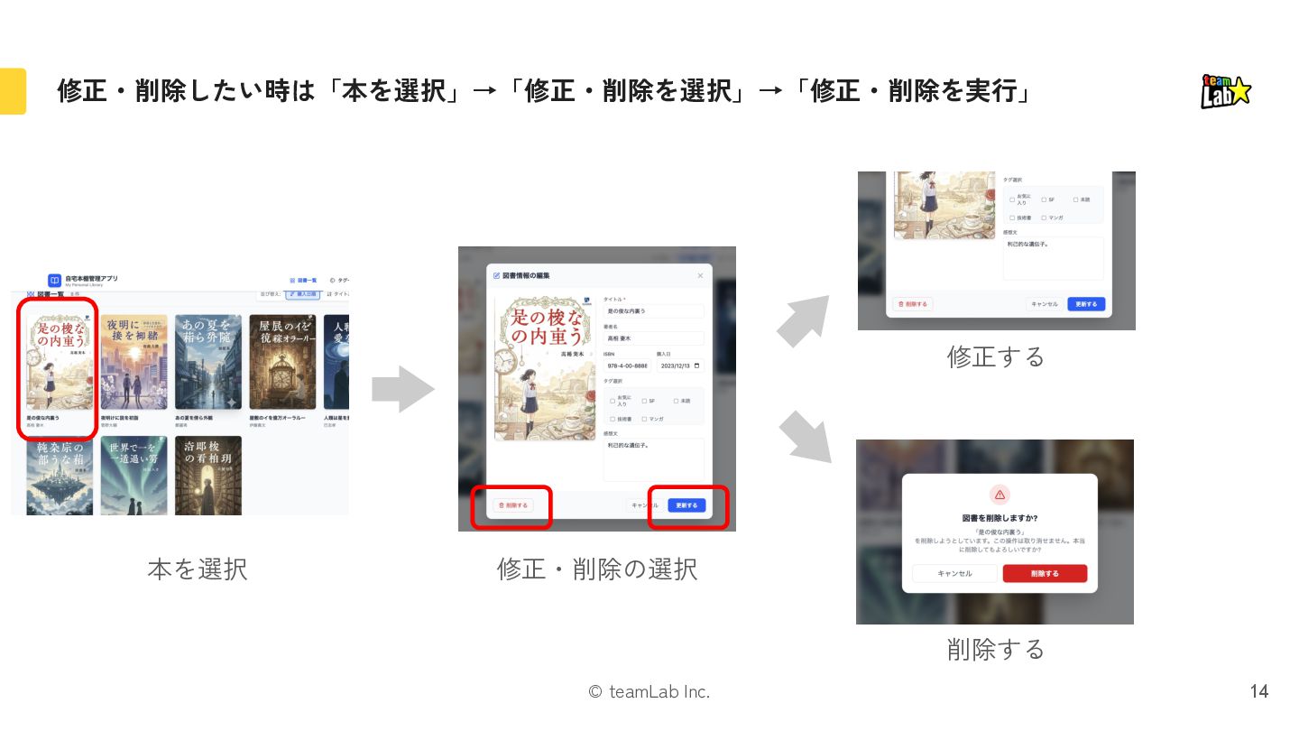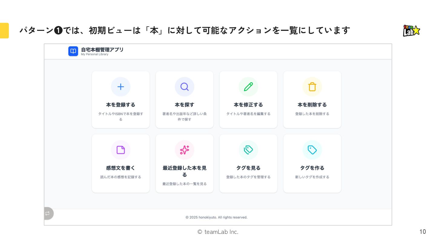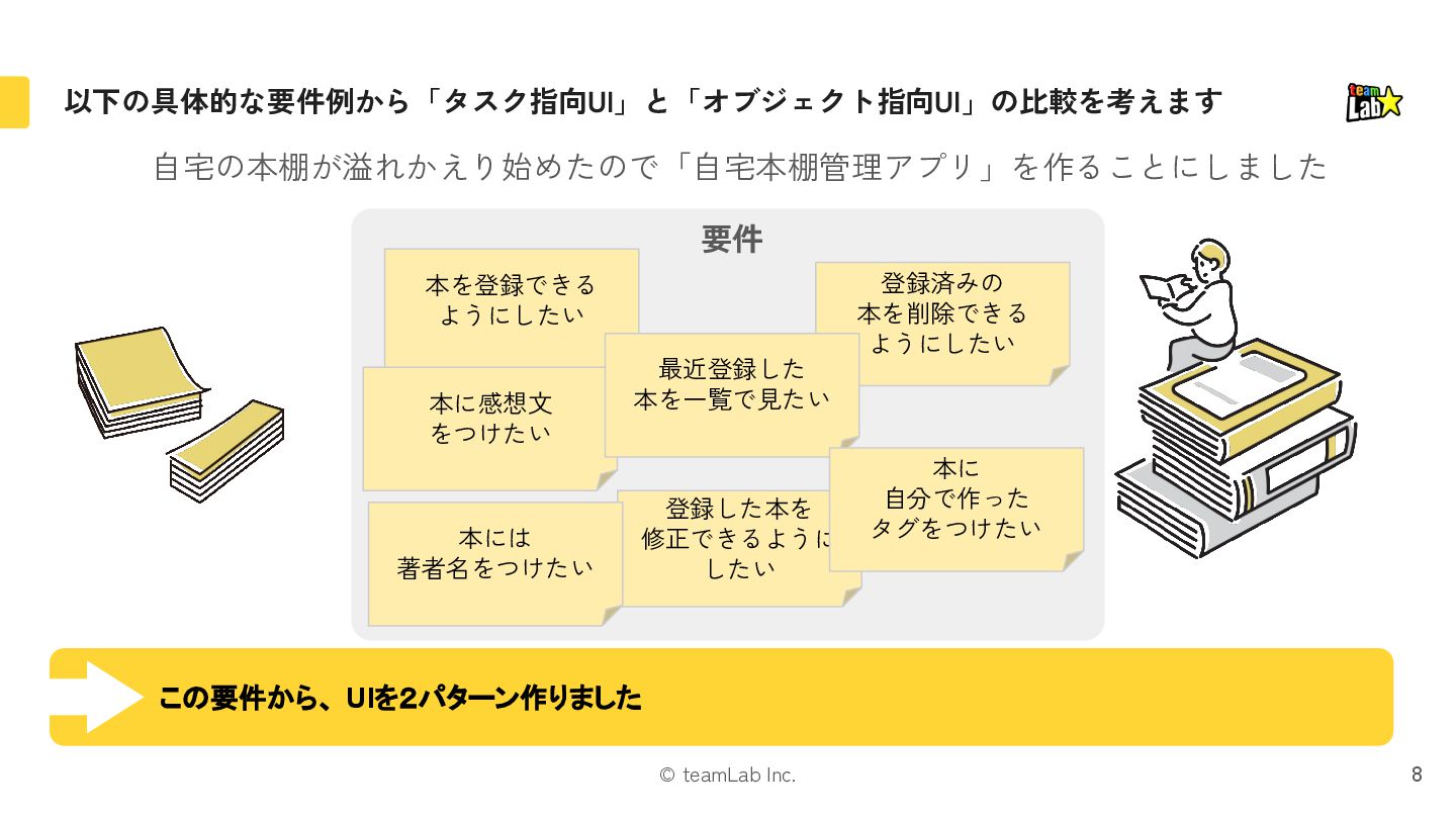 3. © teamLab Inc. 以下の具体的な要件例から「タスク指向UI」と「オブジェクト指向UI」の比較を考えます 8 本を登録できる ようにしたい 登録済みの 本を削除できる ようにしたい