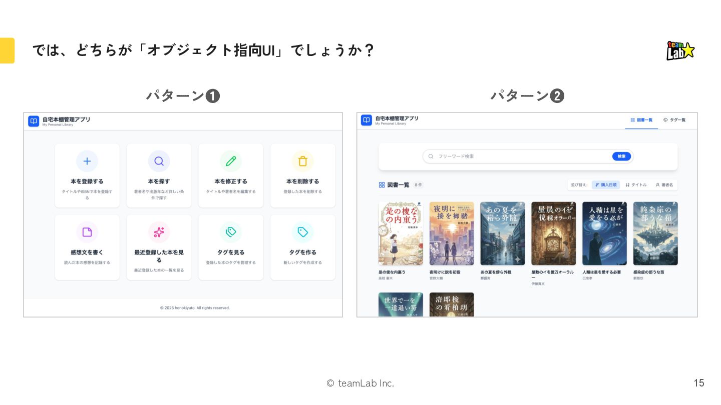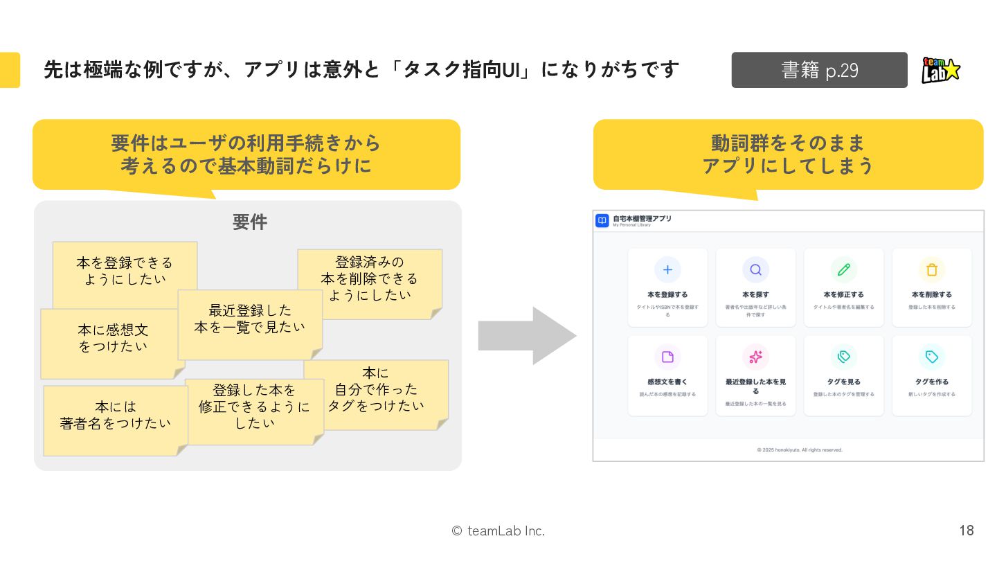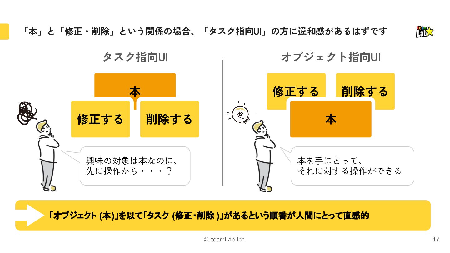 4. © teamLab Inc. 本 削除する 「本」と「修正・削除」という関係の場合、「タスク指向UI」の方に違和感があるはずです 17 修正する タスク指向UI オブジェクト指向UI