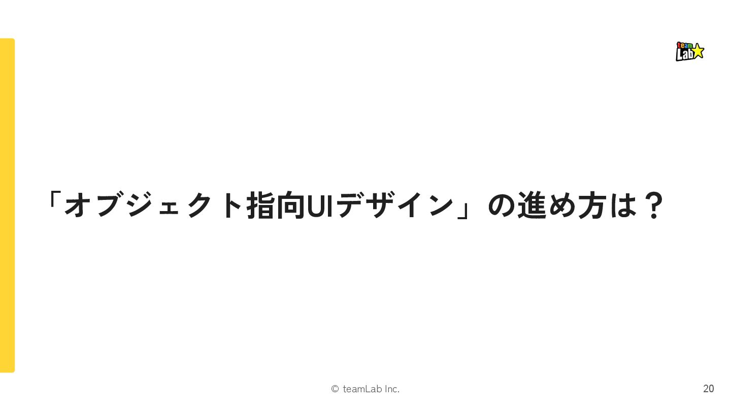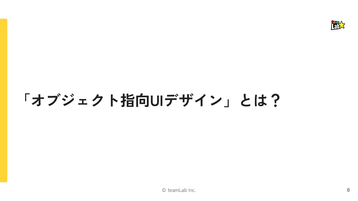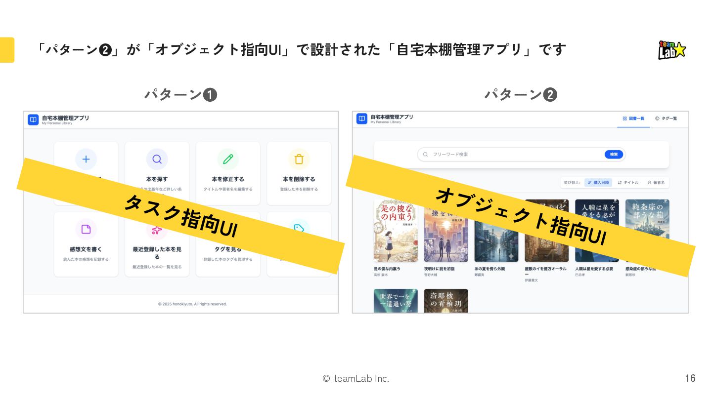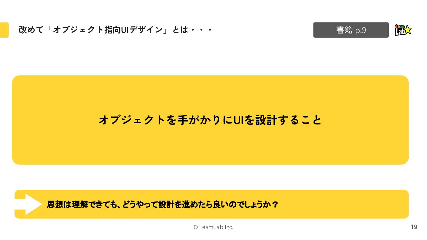 4. © teamLab Inc. 本 削除する 「本」と「修正・削除」という関係の場合、「タスク指向UI」の方に違和感があるはずです 17 修正する タスク指向UI オブジェクト指向UI