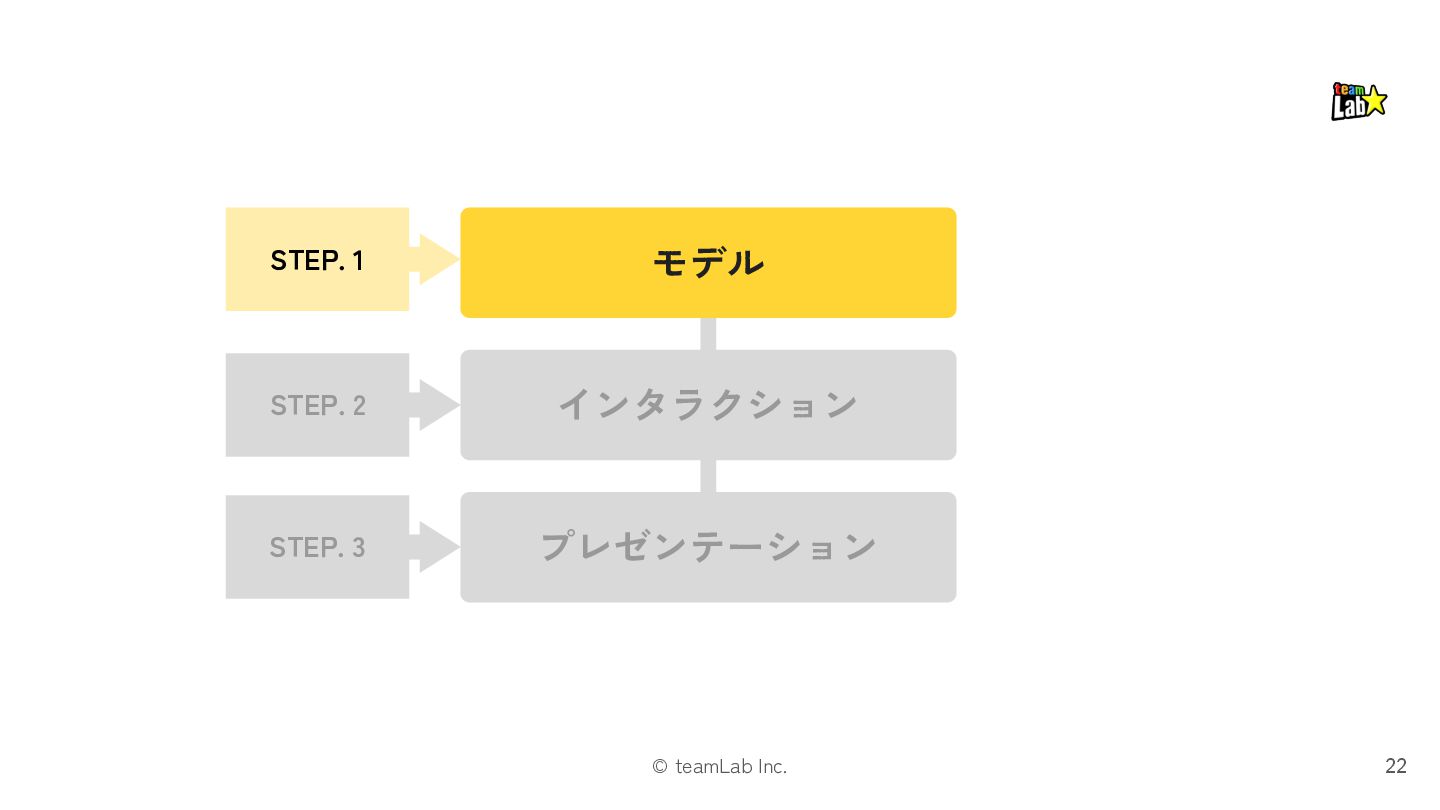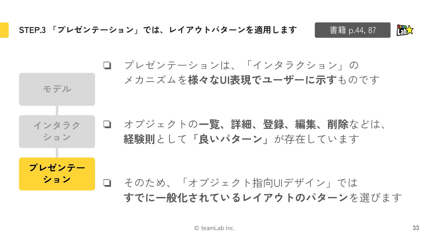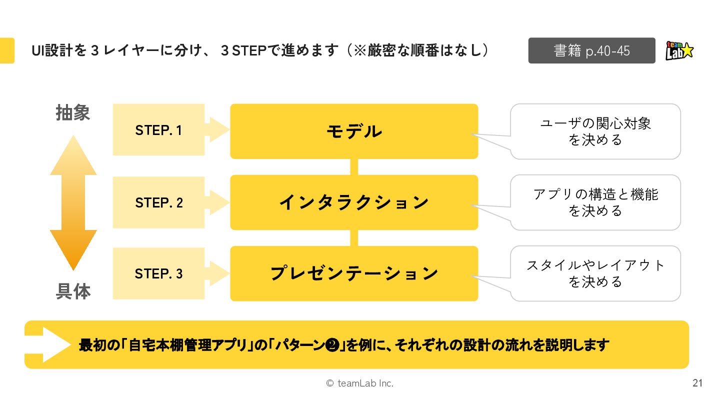 6. © teamLab Inc. UI設計を3レイヤーに分け、3STEPで進めます(※厳密な順番はなし) 21 書籍 p.40-45 モデル インタラクション プレゼンテーション
