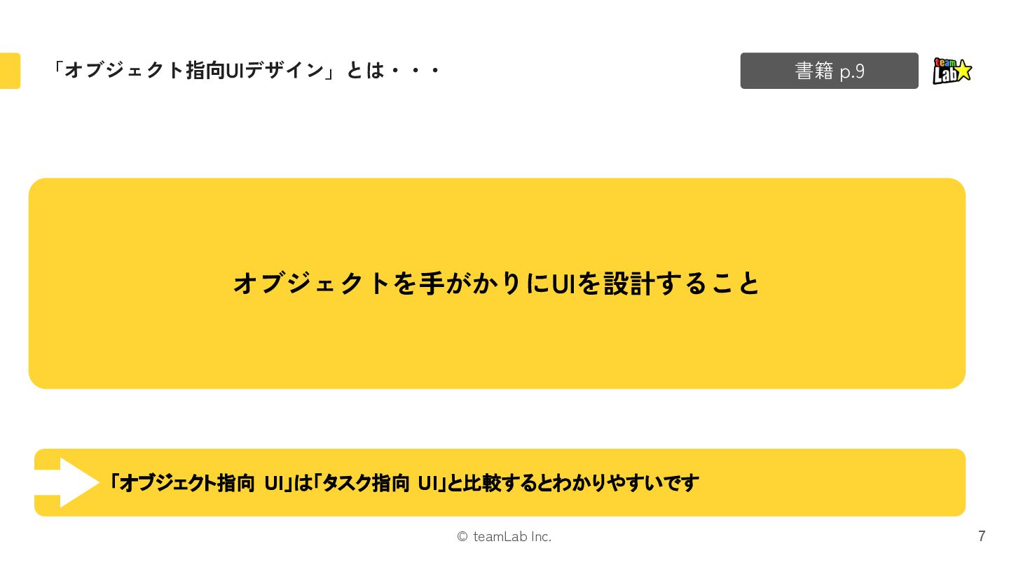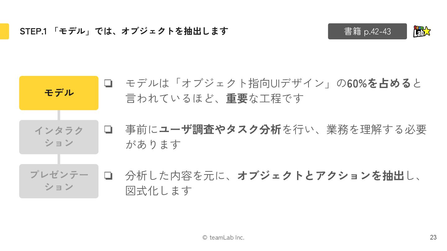 7. © teamLab Inc. STEP.1 「モデル」では、オブジェクトを抽出します 23 書籍 p.42-43 ❏ モデルは「オブジェクト指向UIデザイン」の60%を占めると