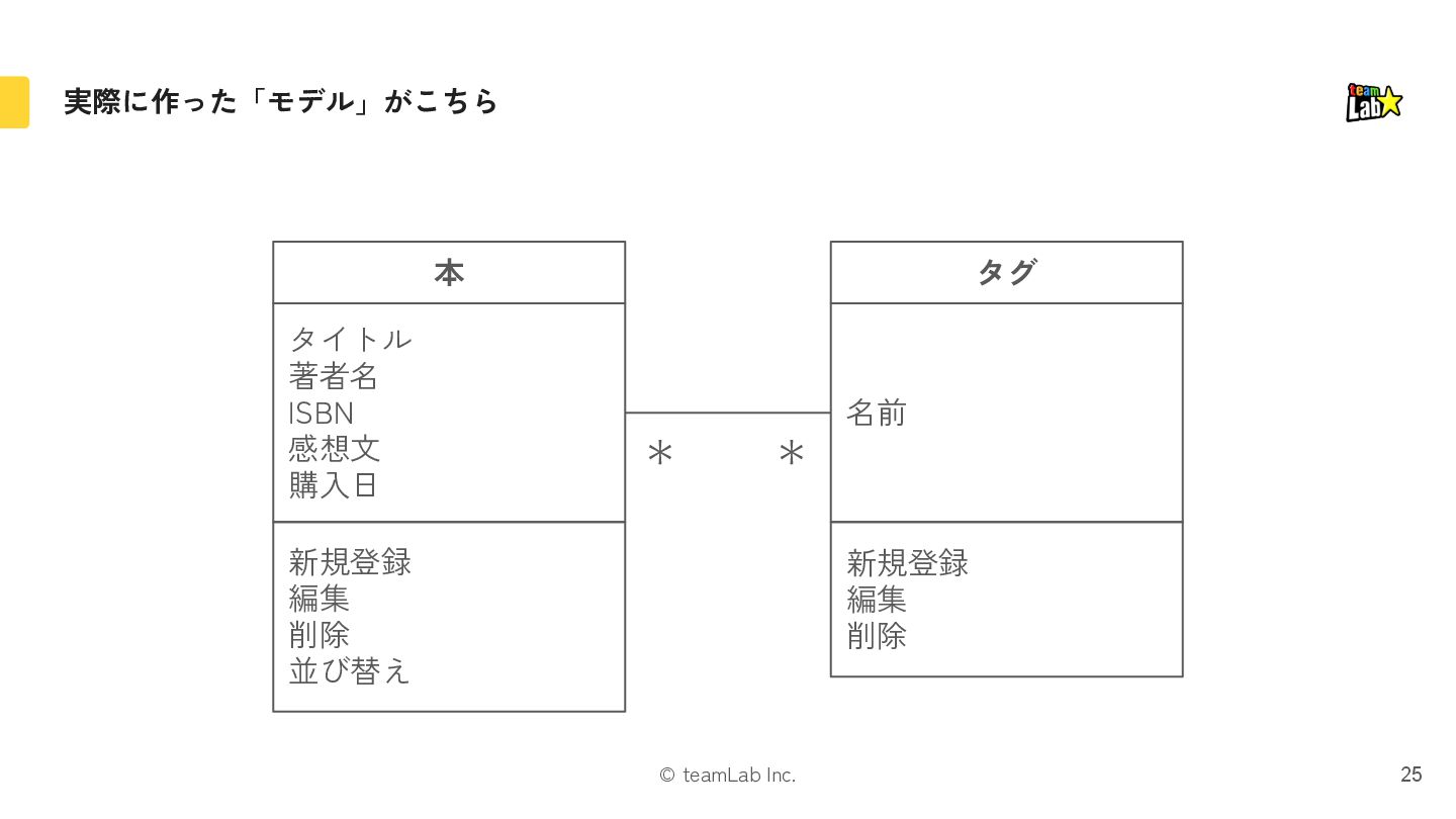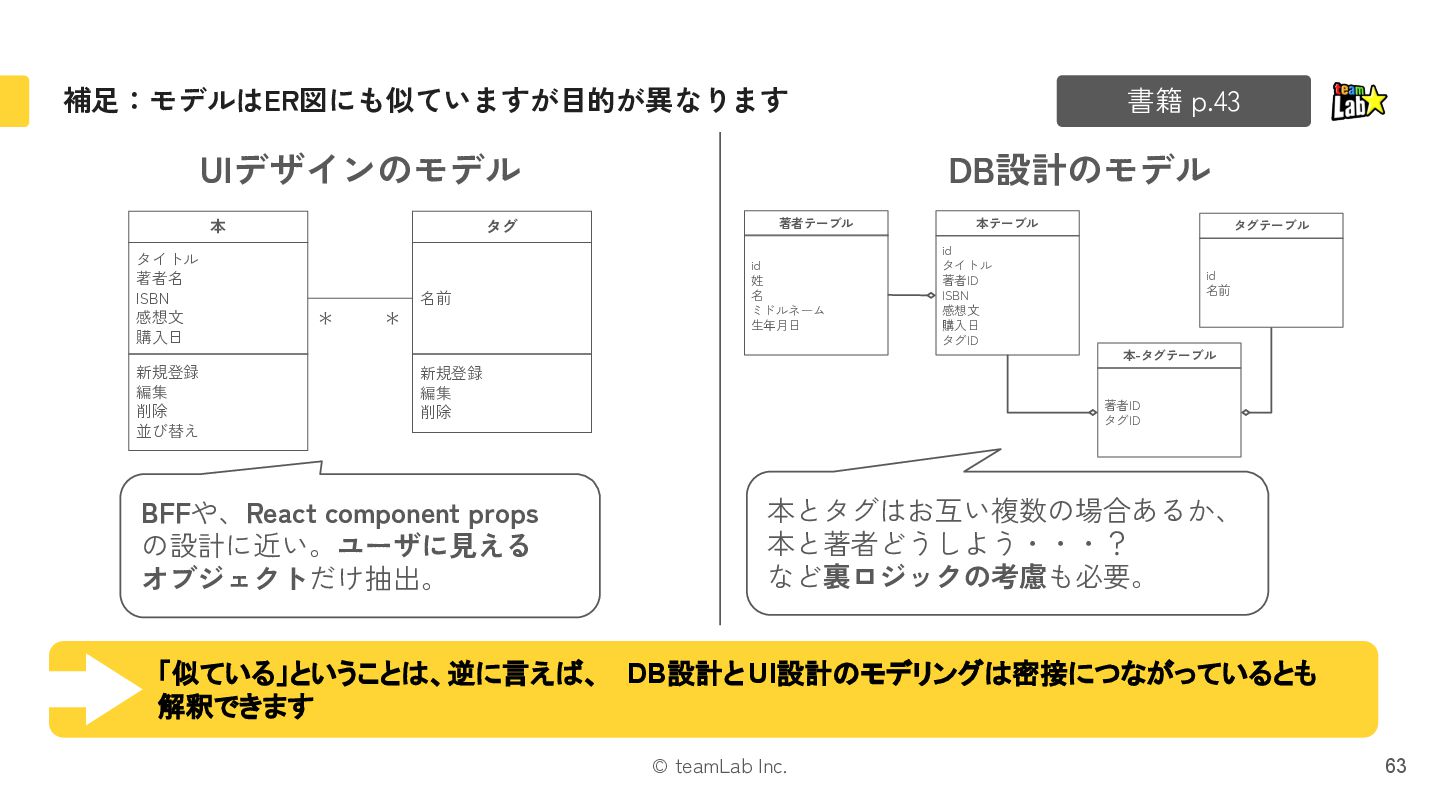 31. © teamLab Inc. 補足:モデルはER図にも似ていますが目的が異なります 63 UIデザインのモデル DB設計のモデル 本テーブル id タイトル