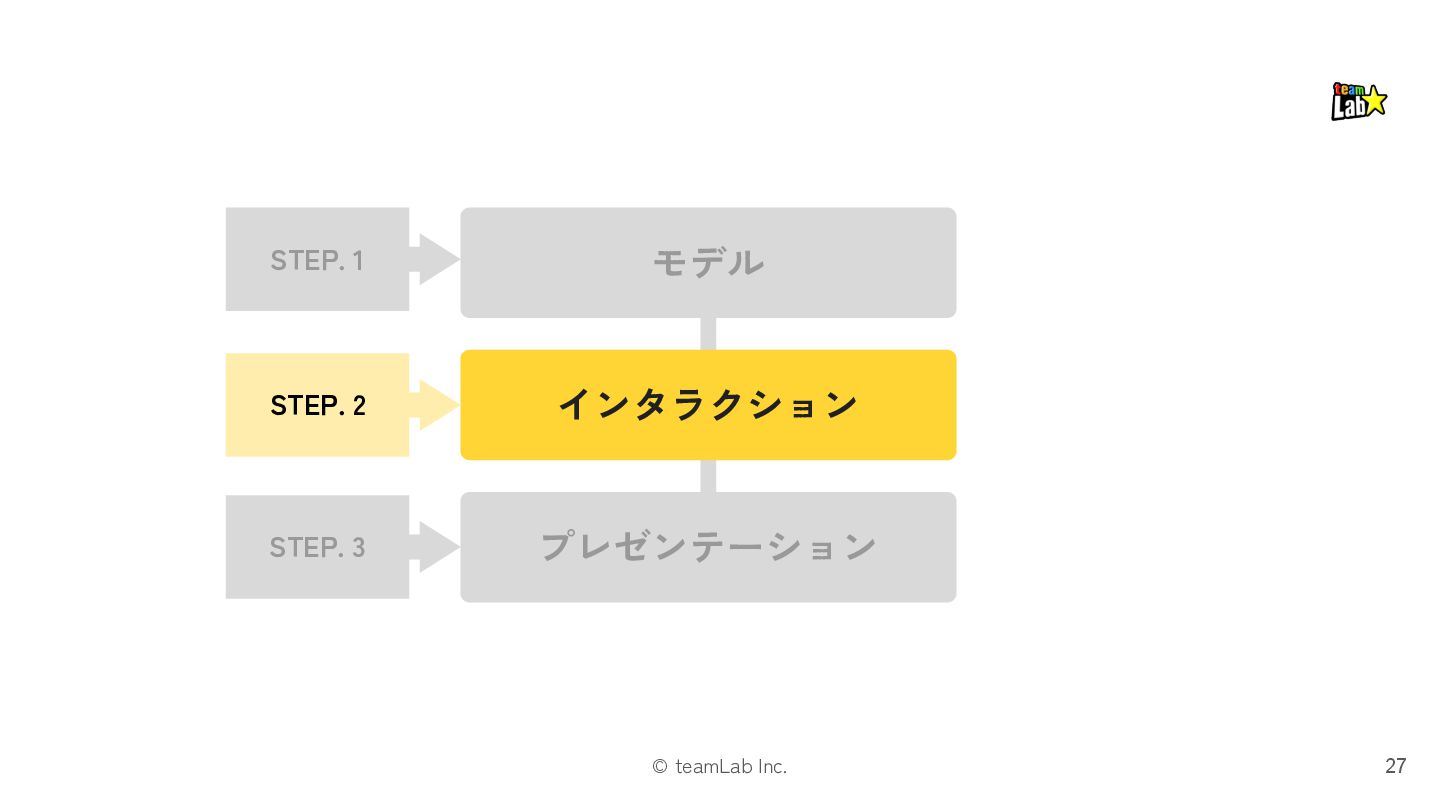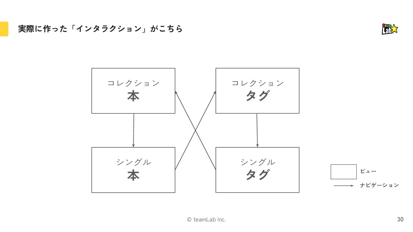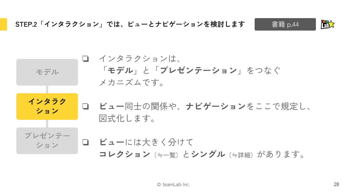 11. © teamLab Inc. STEP.2「インタラクション」では、ビューとナビゲーションを検討します 28 ❏ インタラクションは、 「モデル」と「プレゼンテーション」をつなぐ メカニズムです。 ❏