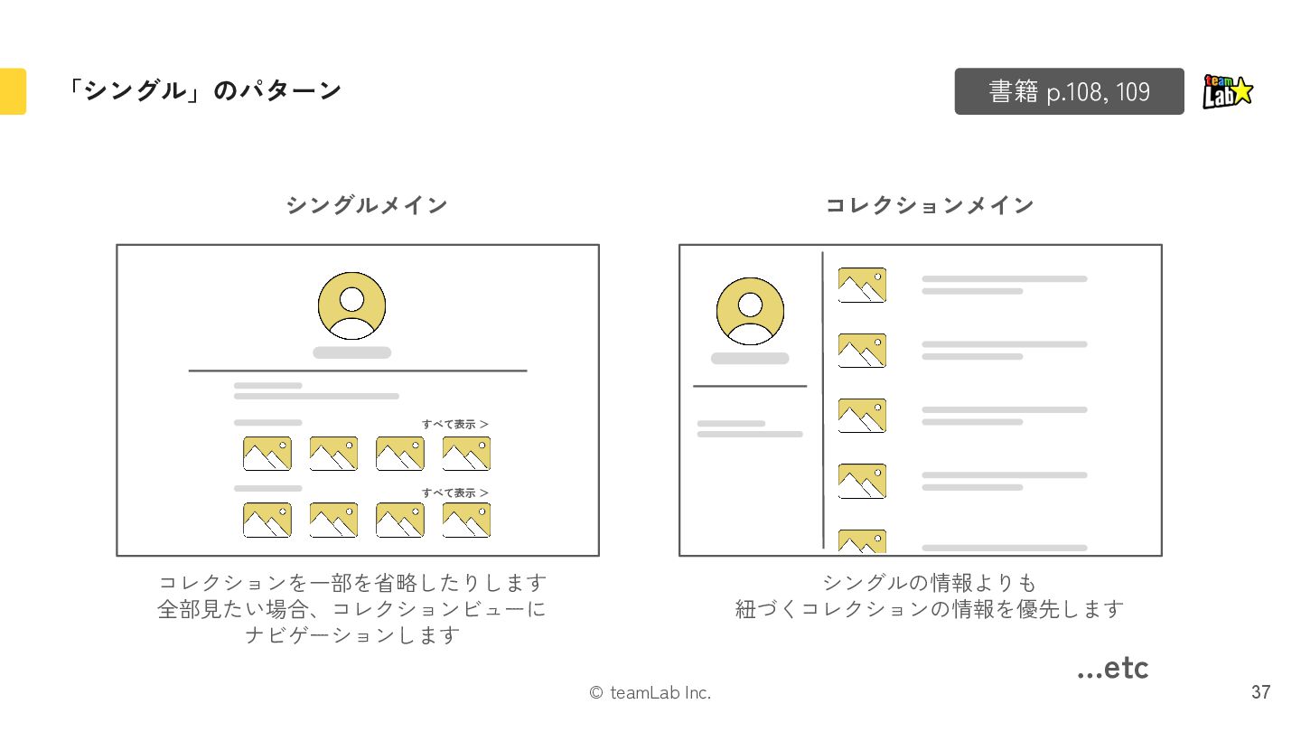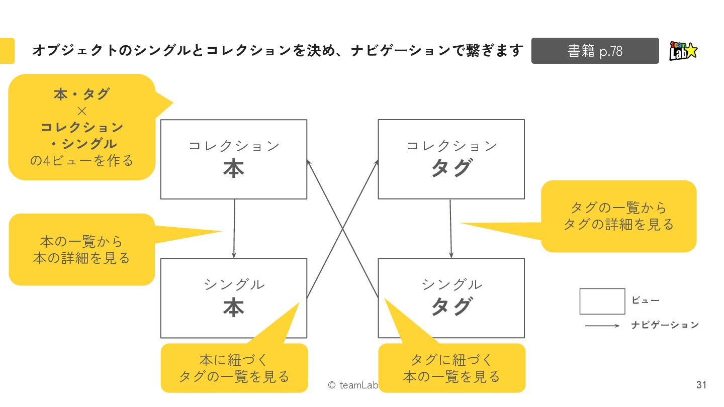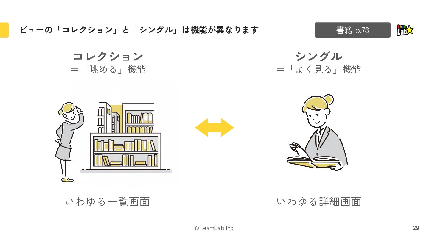 12. © teamLab Inc. オブジェクトのシングルとコレクションを決め、ナビゲーションで繋ぎます 31 書籍 p.78 シングル 本 コレクション