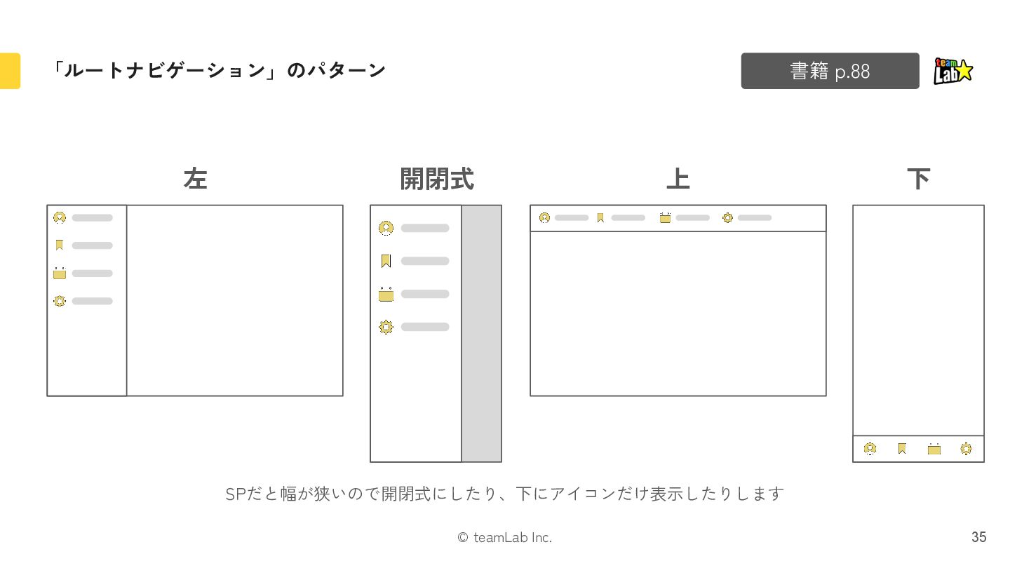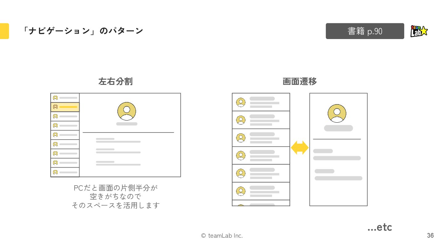 15. © teamLab Inc. 「ナビゲーション」のパターン 書籍 p.90 36 左右分割 36 画面遷移