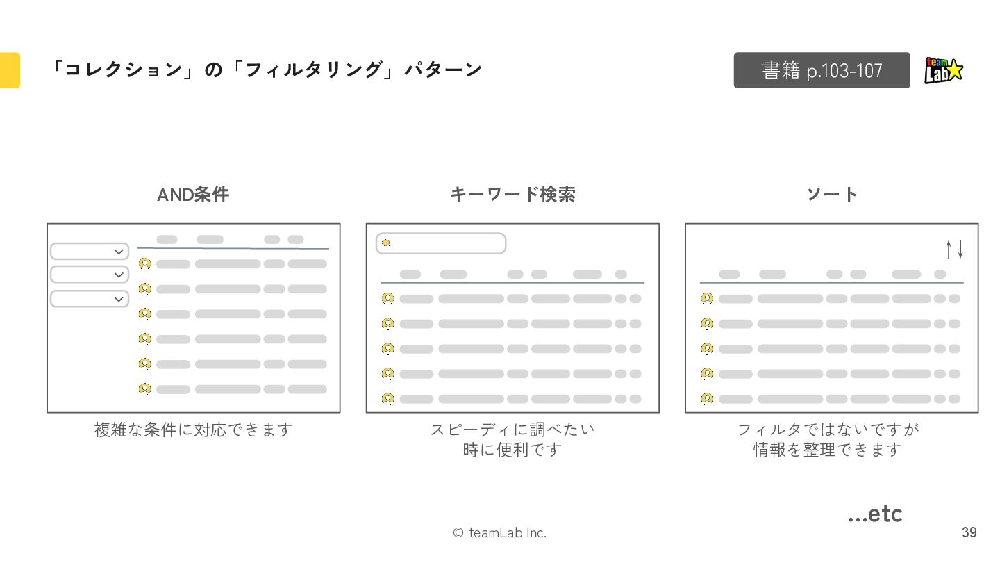 18. © teamLab Inc. 「コレクション」の「フィルタリング」パターン 書籍 p.103-107 39 AND条件 キーワード検索 ソート