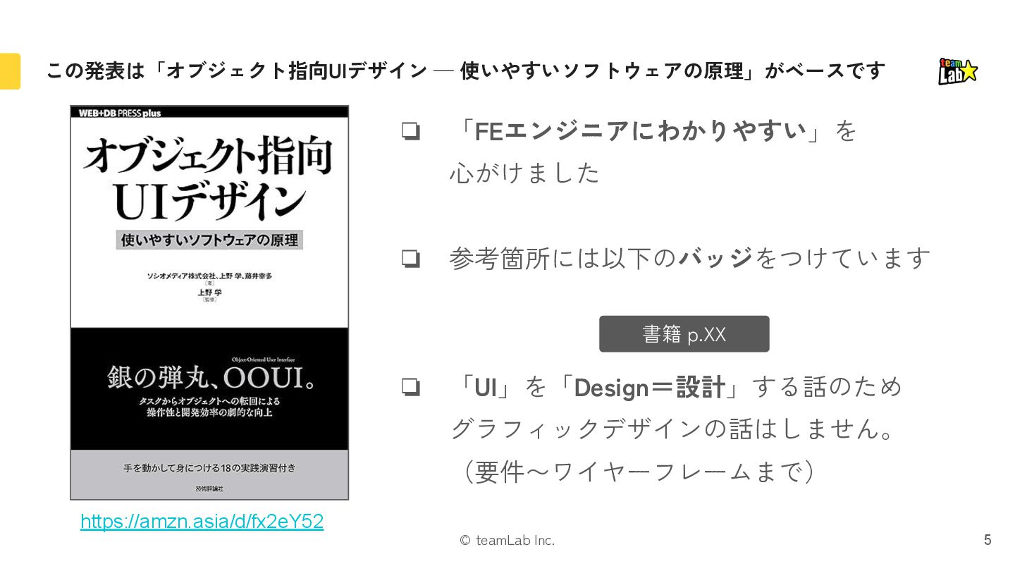 2. © teamLab Inc. この発表は「オブジェクト指向UIデザイン ─ 使いやすいソフトウェアの原理」がベースです 5 https://amzn.asia/d/fx2eY52 ❏ 「FEエンジニアにわかりやすい」を