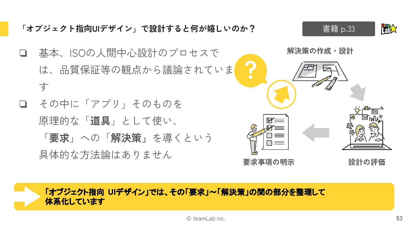 原理的な「道具」として使い、 「要求」への「解決策」を導くという 具体的な方法論はありません 53 書籍 p.33 「オブジェクト指向 UIデザイン」では、その「要求」〜「解決策」の間の部分を整理して 体系化しています 設計の評価 解決策の作成・設計 要求事項の明示 ?