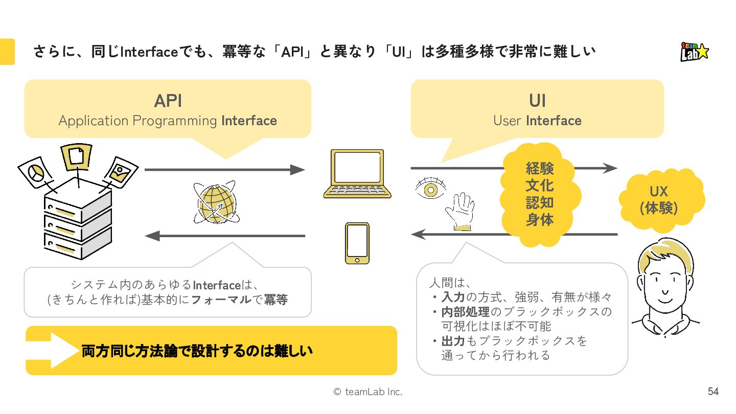 25. © teamLab Inc. さらに、同じInterfaceでも、冪等な「API」と異なり「UI」は多種多様で非常に難しい 54 API Application Programming Interface UI