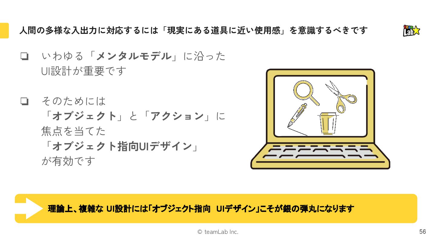 27. © teamLab Inc. 人間の多様な入出力に対応するには「現実にある道具に近い使用感」を意識するべきです ❏ いわゆる「メンタルモデル」に沿った UI設計が重要です ❏ そのためには 「オブジェクト」と「アクション」に