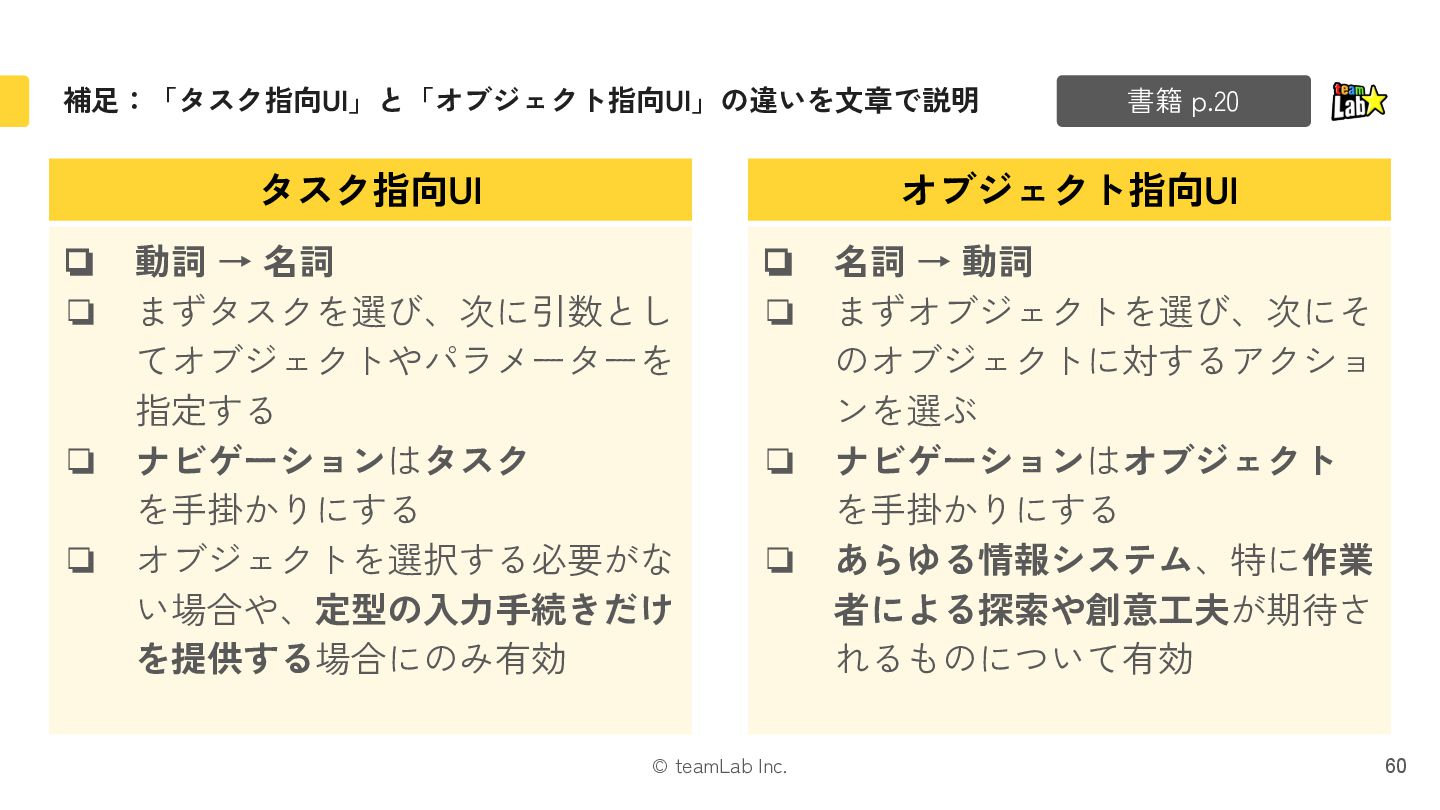 まずオブジェクトを選び、次にそ のオブジェクトに対するアクショ ンを選ぶ ❏ ナビゲーションはオブジェクト を手掛かりにする ❏ あらゆる情報システム、特に作業 者による探索や創意工夫が期待さ れるものについて有効 ❏ 動詞 → 名詞 ❏ まずタスクを選び、次に引数とし てオブジェクトやパラメーターを 指定する ❏ ナビゲーションはタスク を手掛かりにする ❏ オブジェクトを選択する必要がな い場合や、定型の入力手続きだけ を提供する場合にのみ有効 書籍 p.20 オブジェクト指向UI タスク指向UI