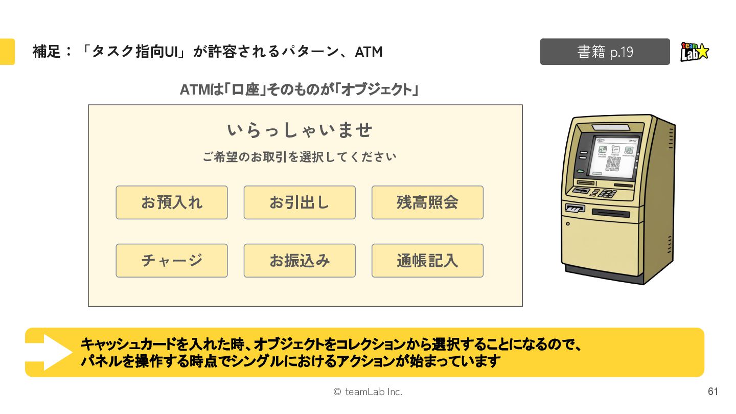 29. © teamLab Inc. 補足:「タスク指向UI」が許容されるパターン、ATM 61 書籍 p.19 お預入れ お引出し 残高照会