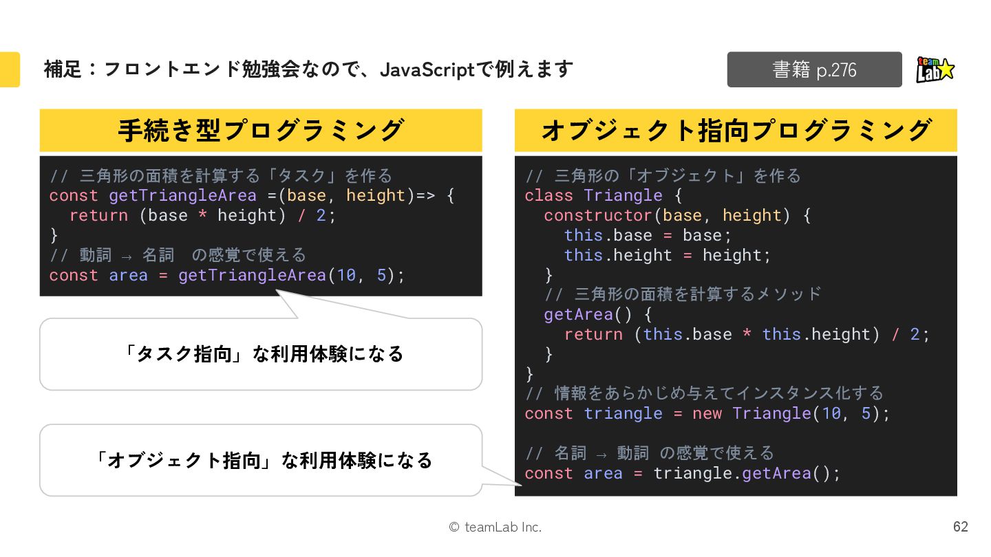Triangle { constructor(base, height) { this.base = base; this.height = height; } // 三角形の面積を計算するメソッド getArea() { return (this.base * this.height) / 2; } } // 情報をあらかじめ与えてインスタンス化する const triangle = new Triangle(10, 5); // 名詞 → 動詞 の感覚で使える const area = triangle.getArea(); // 三角形の面積を計算する「タスク」を作る const getTriangleArea =(base, height)=> { return (base * height) / 2; } // 動詞 → 名詞 の感覚で使える const area = getTriangleArea(10, 5); 「オブジェクト指向」な利用体験になる 「タスク指向」な利用体験になる 書籍 p.276
