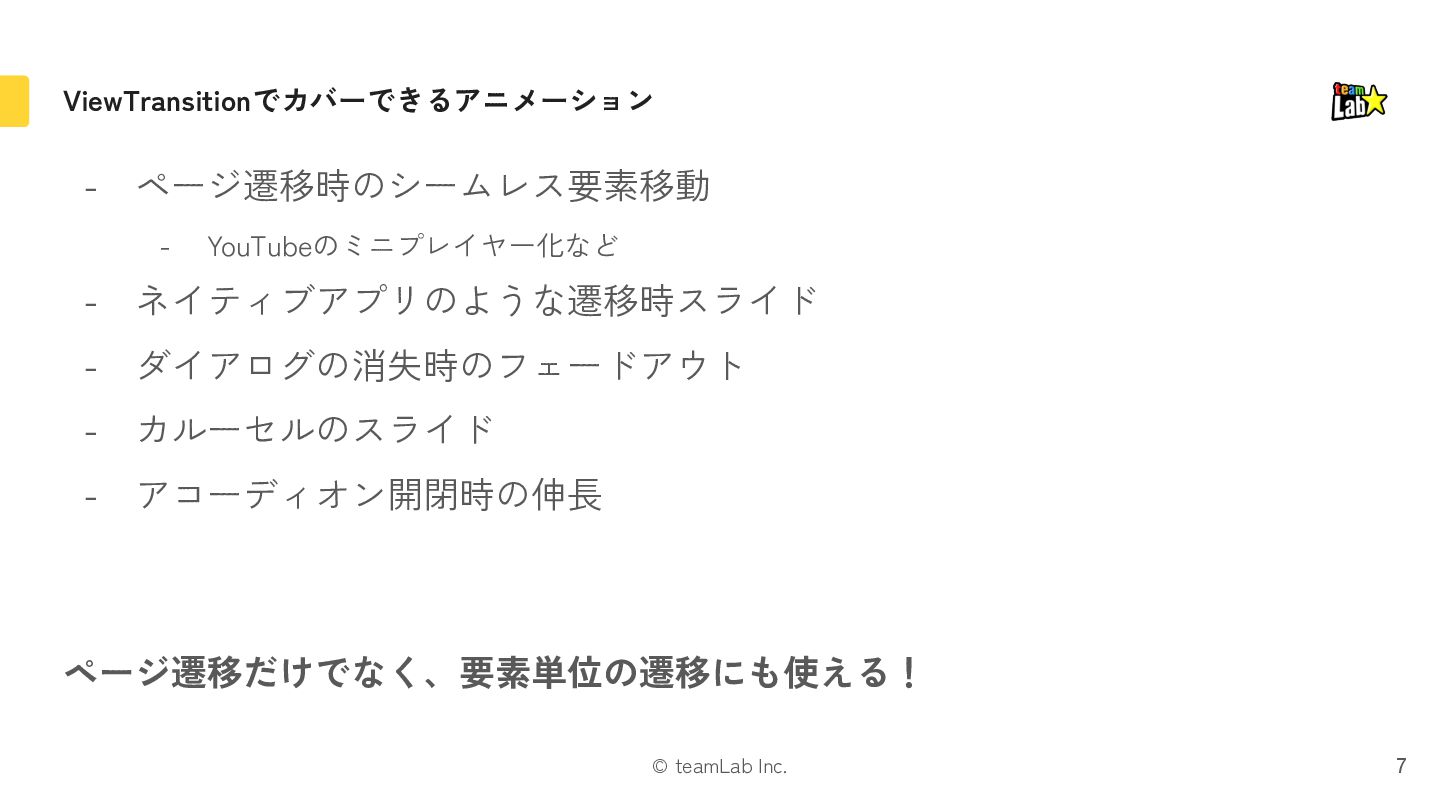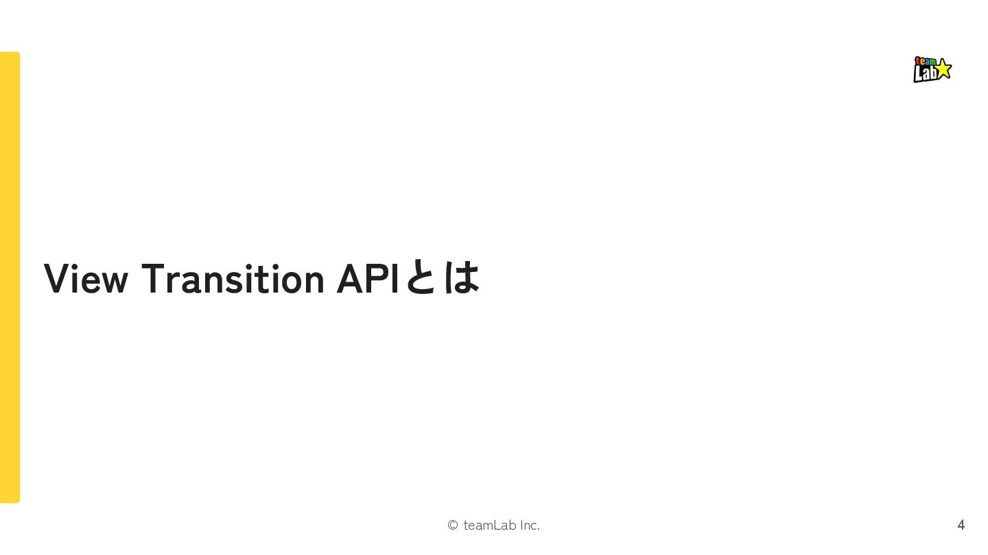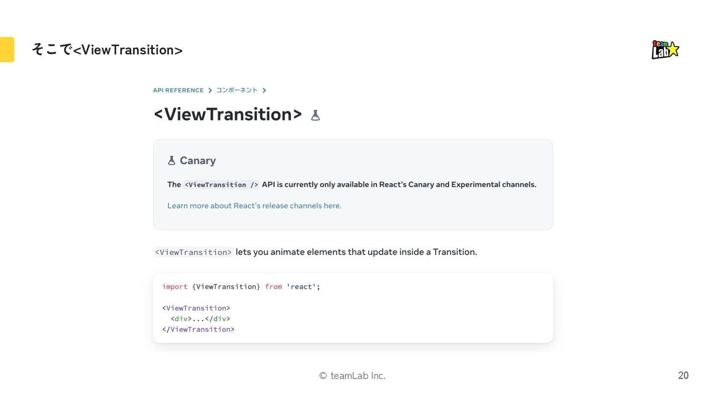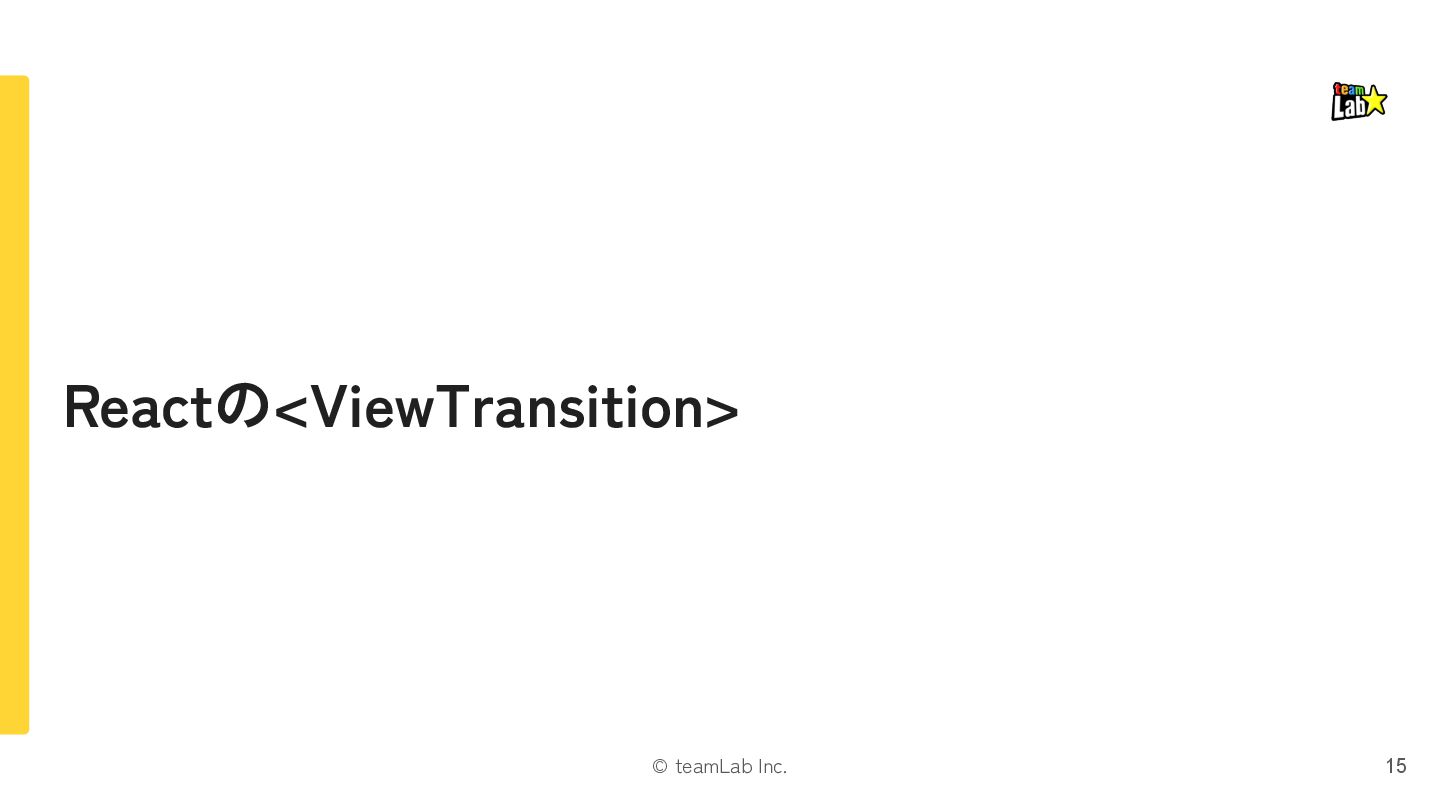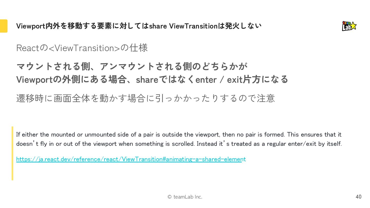 exit片方になる 遷移時に画面全体を動かす場合に引っかかったりするので注意 If either the mounted or unmounted side of a pair is outside the viewport, then no pair is formed. This ensures that it doesn’t fly in or out of the viewport when something is scrolled. Instead it’s treated as a regular enter/exit by itself. https://ja.react.dev/reference/react/ViewTransition#animating-a-shared-element