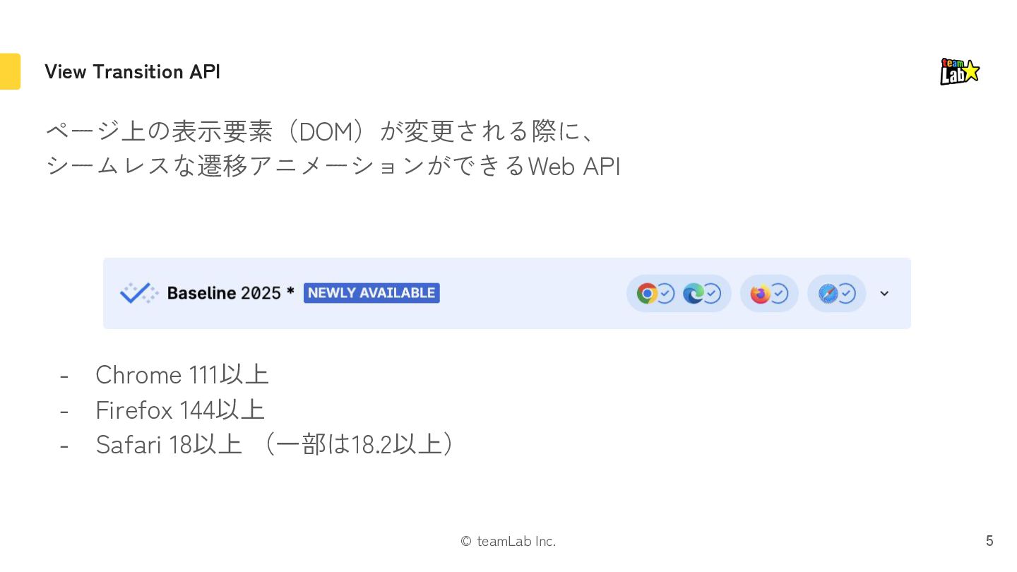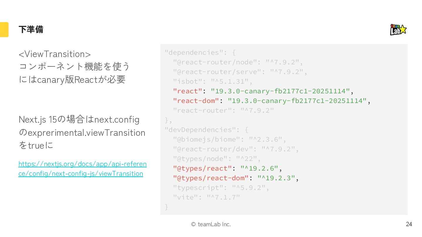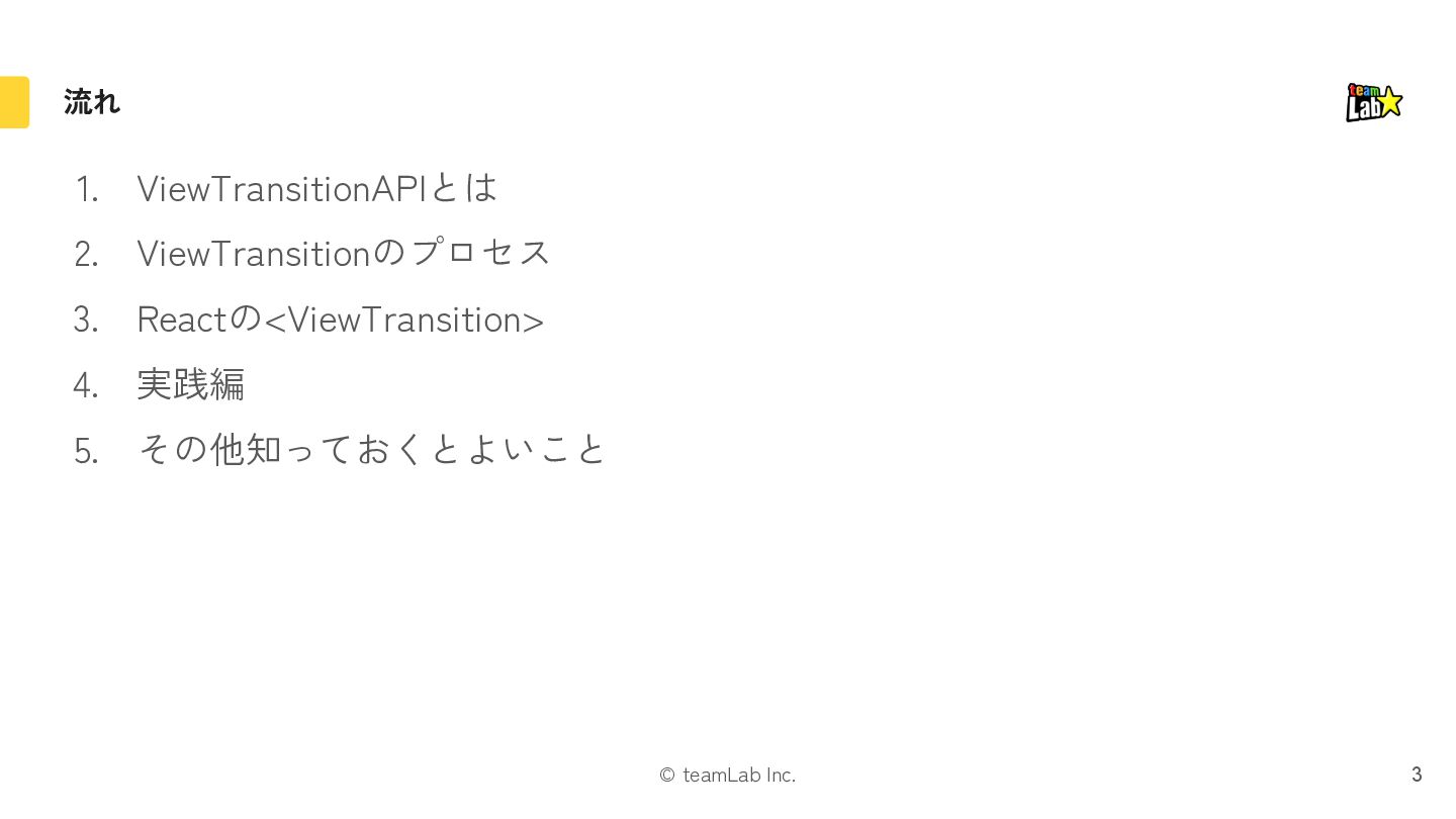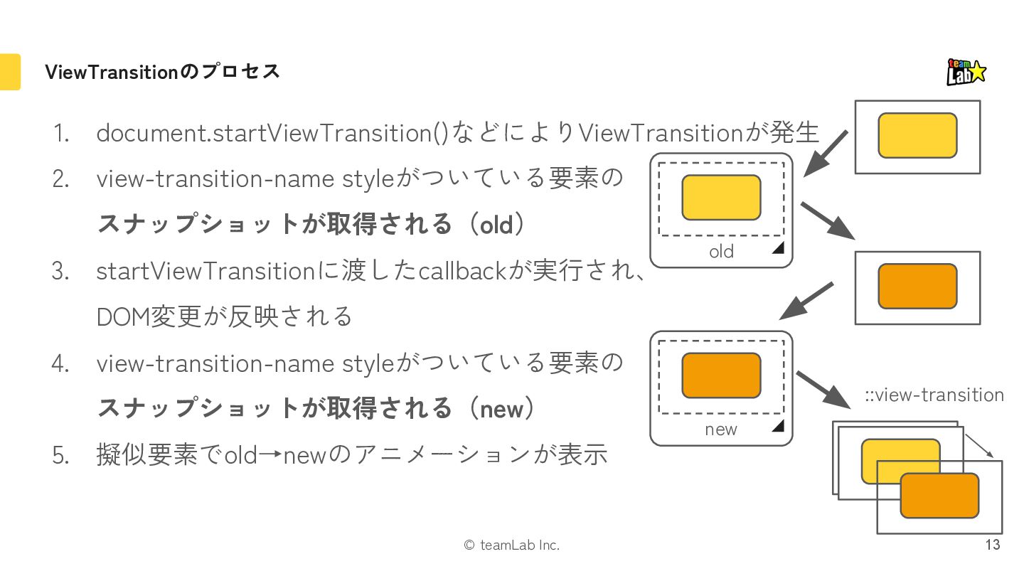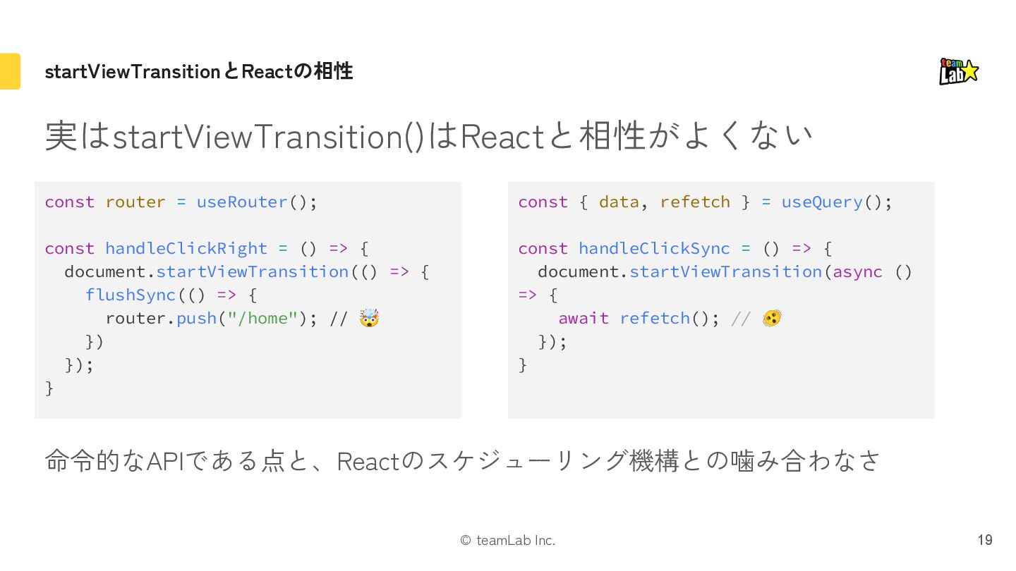 exit片方になる 遷移時に画面全体を動かす場合に引っかかったりするので注意 If either the mounted or unmounted side of a pair is outside the viewport, then no pair is formed. This ensures that it doesn’t fly in or out of the viewport when something is scrolled. Instead it’s treated as a regular enter/exit by itself. https://ja.react.dev/reference/react/ViewTransition#animating-a-shared-element