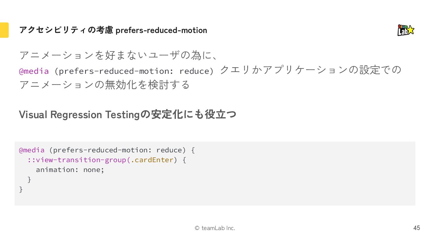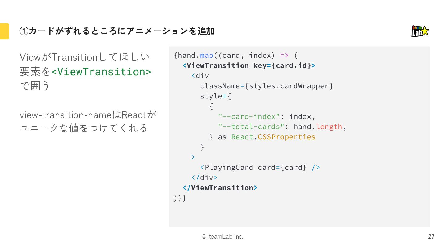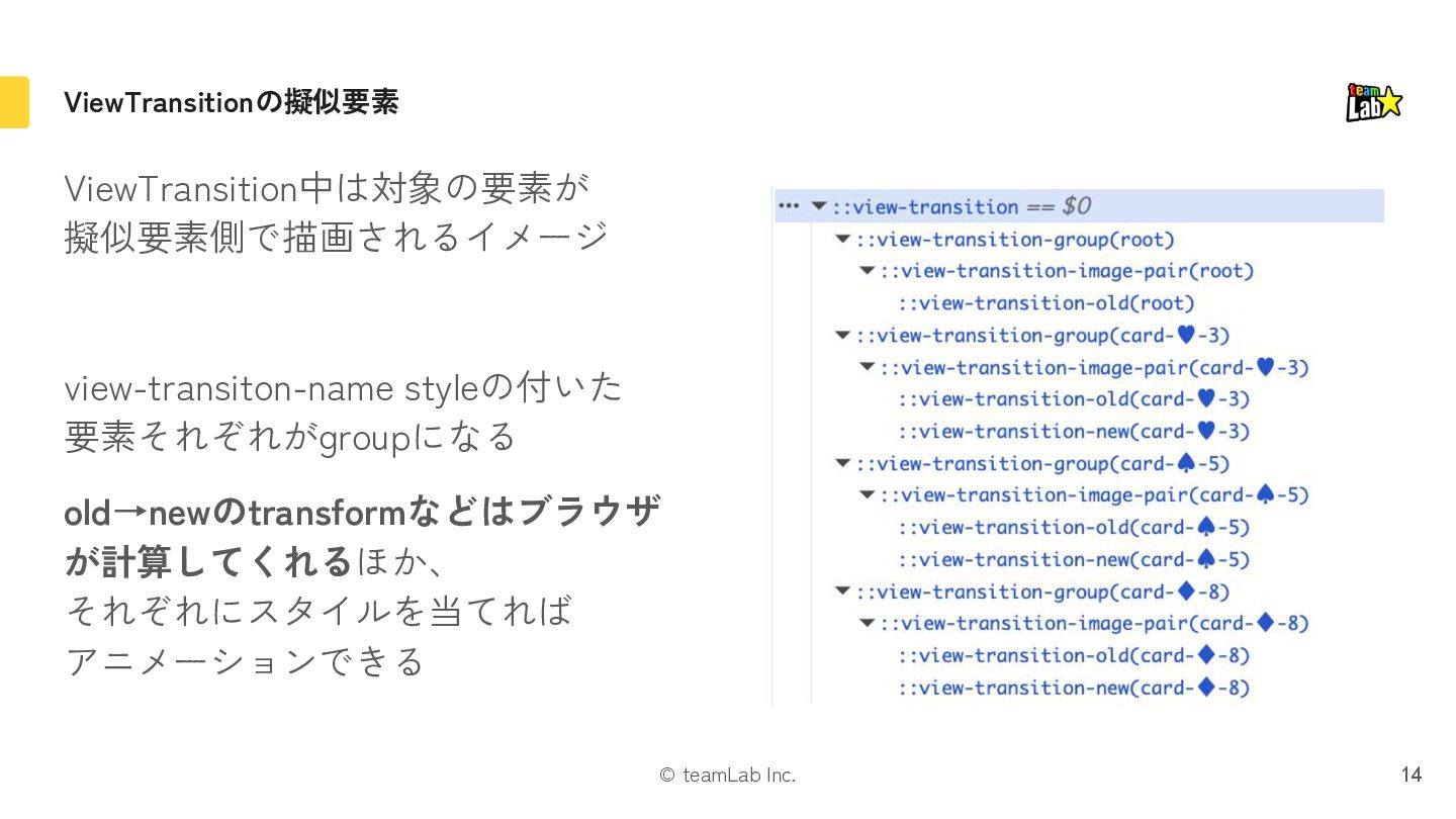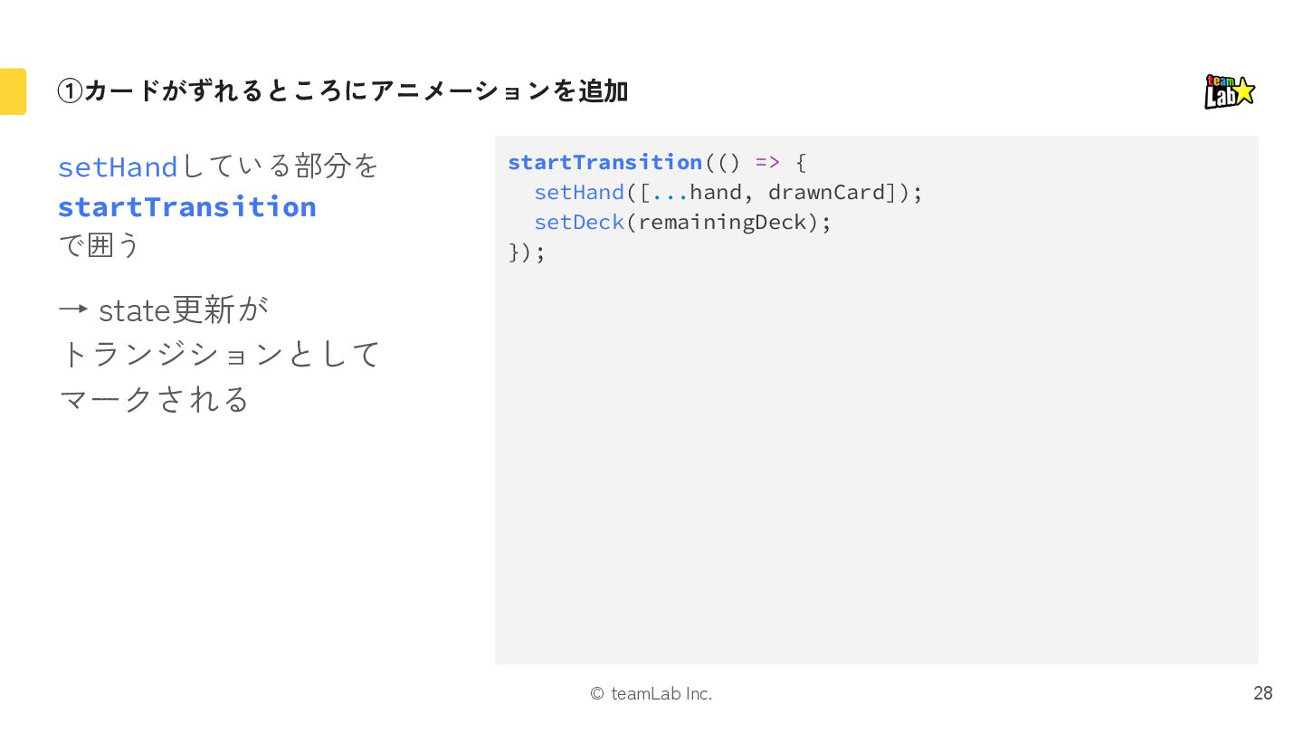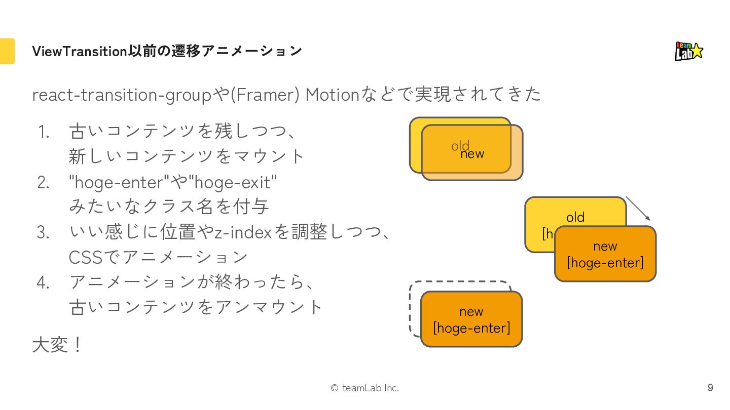 "hoge-enter"や"hoge-exit" みたいなクラス名を付与 3. いい感じに位置やz-indexを調整しつつ、 CSSでアニメーション 4. アニメーションが終わったら、 古いコンテンツをアンマウント 大変! 9 old new old [hoge-exit] new [hoge-enter] old [hoge-exit] new [hoge-enter]