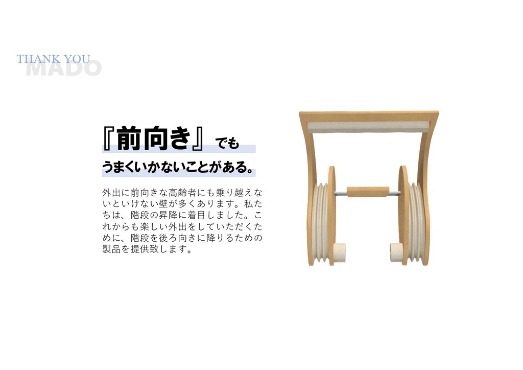 THANK YOU 外出に前向きな⾼齢者にも乗り越えな いといけない壁が多くあります。私た ちは、階段の昇降に着⽬しました。こ れからも楽しい外出をしていただくた めに、階段を後ろ向きに降りるための 製品を提供致します。