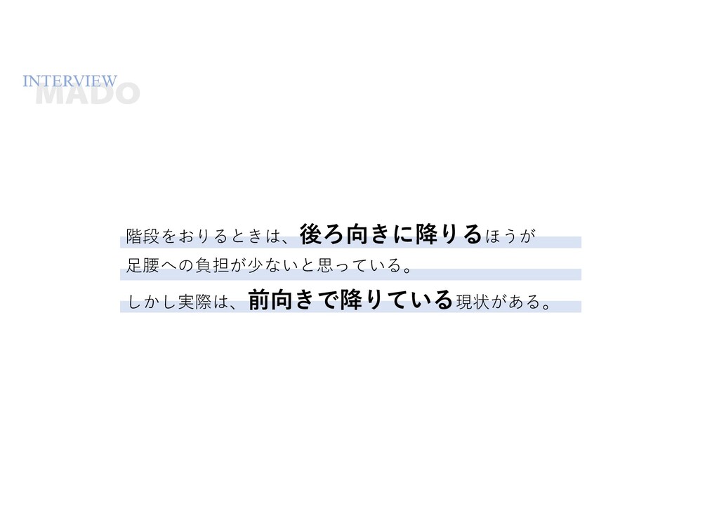 階段をおりるときは、ޙΖ͖ʹ߱ΓΔほうが ⾜腰への負担が少ないと思っている。 しかし実際は、લ͖Ͱ߱Γ͍ͯΔ現状がある。 INTERVIEW