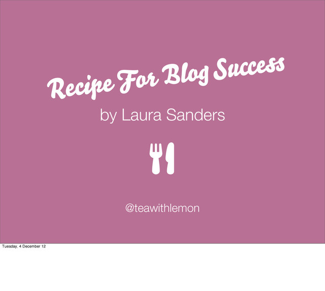 project someone else’s persona Use your personality, your words, your interests, your opinions, your writing style Tuesday, 4 December 12 You don’t have to be a leading expert or a stand-up comedian for your blog to be interesting. People like hearing what other normal people have to say. Chances are your friends like you because of your personality so you should be true to it and people online will like it too. I started writing for myself, and I’ve continued that and just settled into my writing style