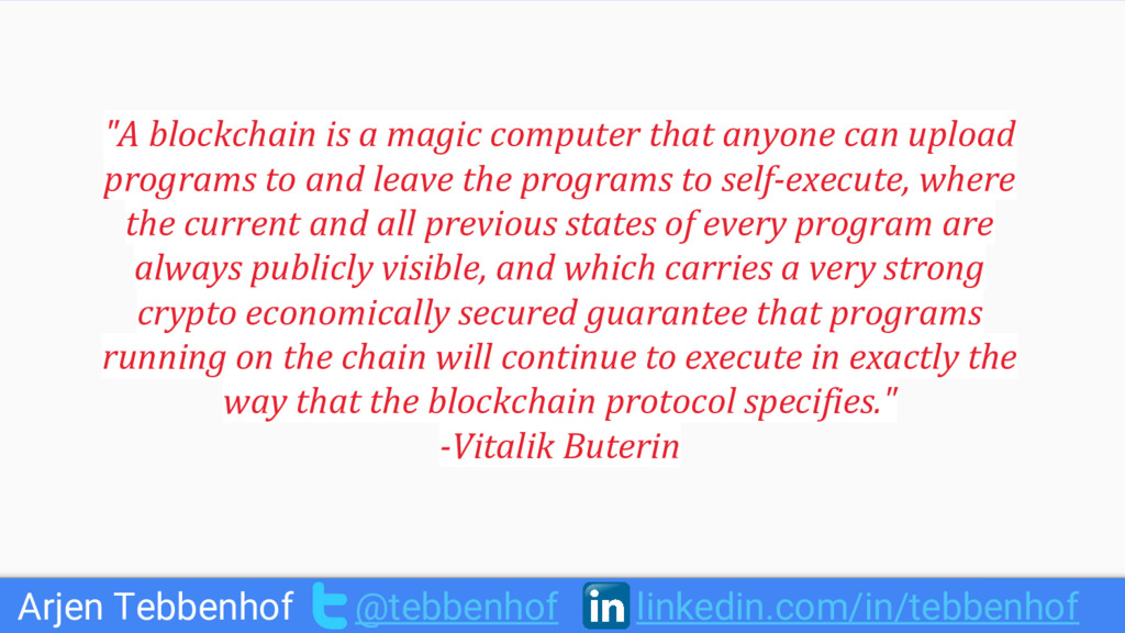 that anyone can upload programs to and leave the programs to self-execute, where the current and all previous states of every program are always publicly visible, and which carries a very strong crypto economically secured guarantee that programs running on the chain will continue to execute in exactly the way that the blockchain protocol specifies." -Vitalik Buterin