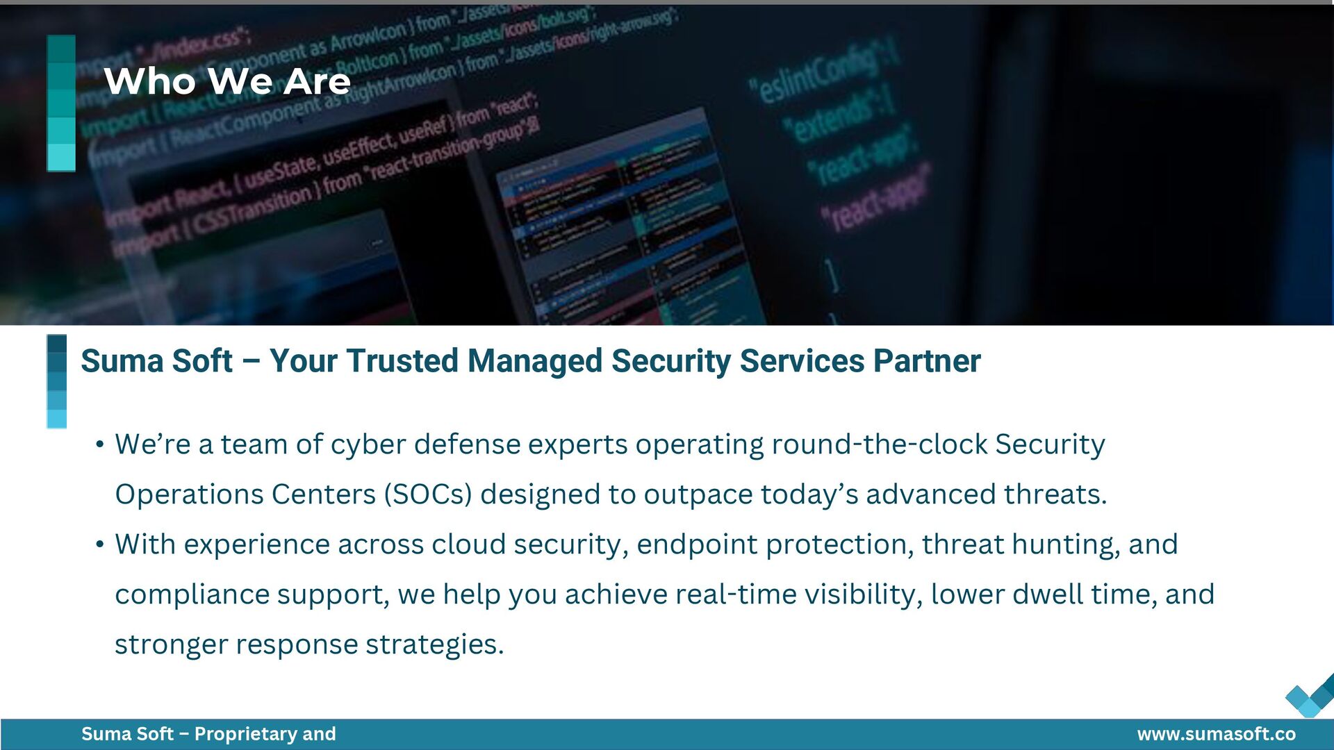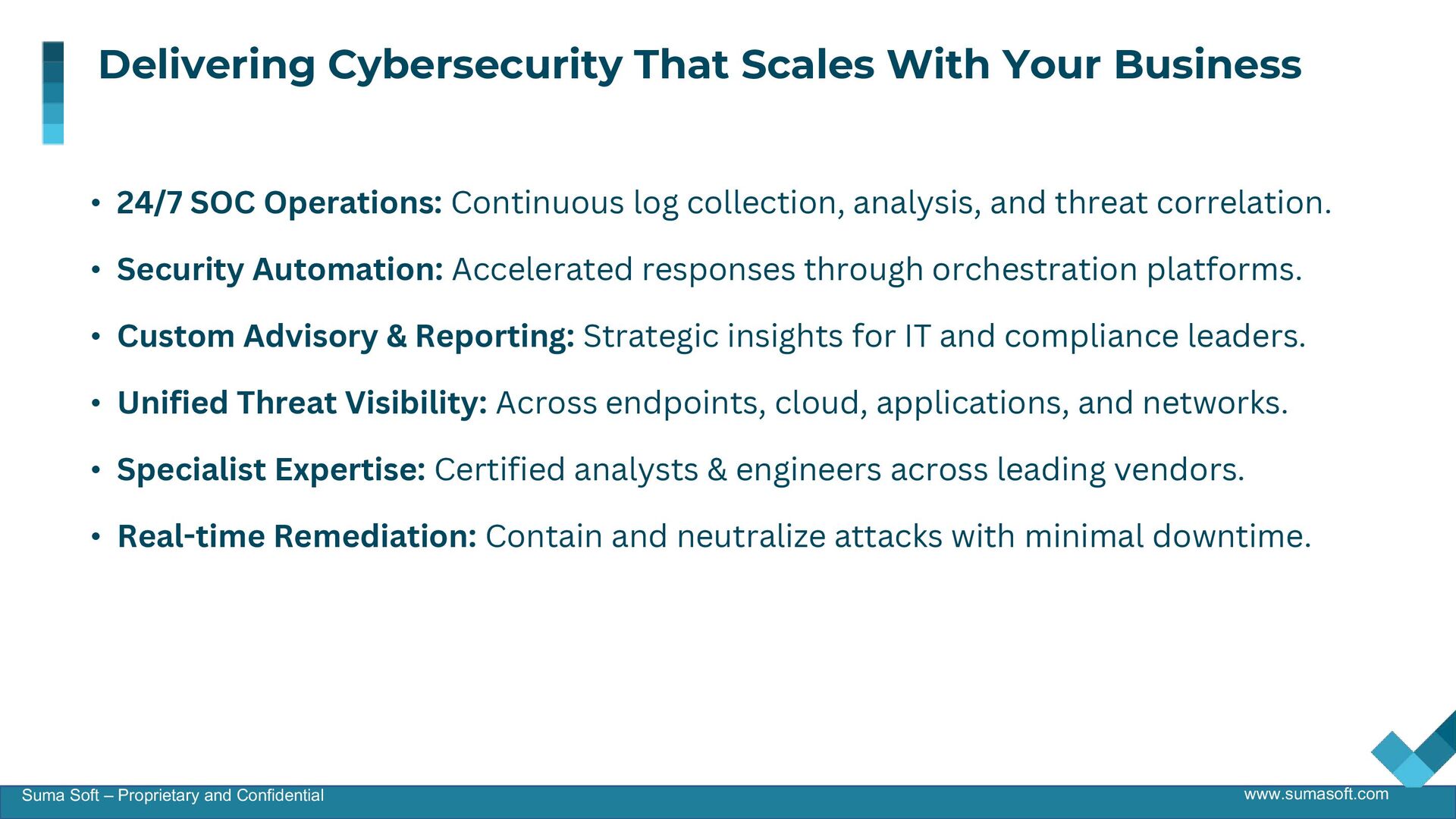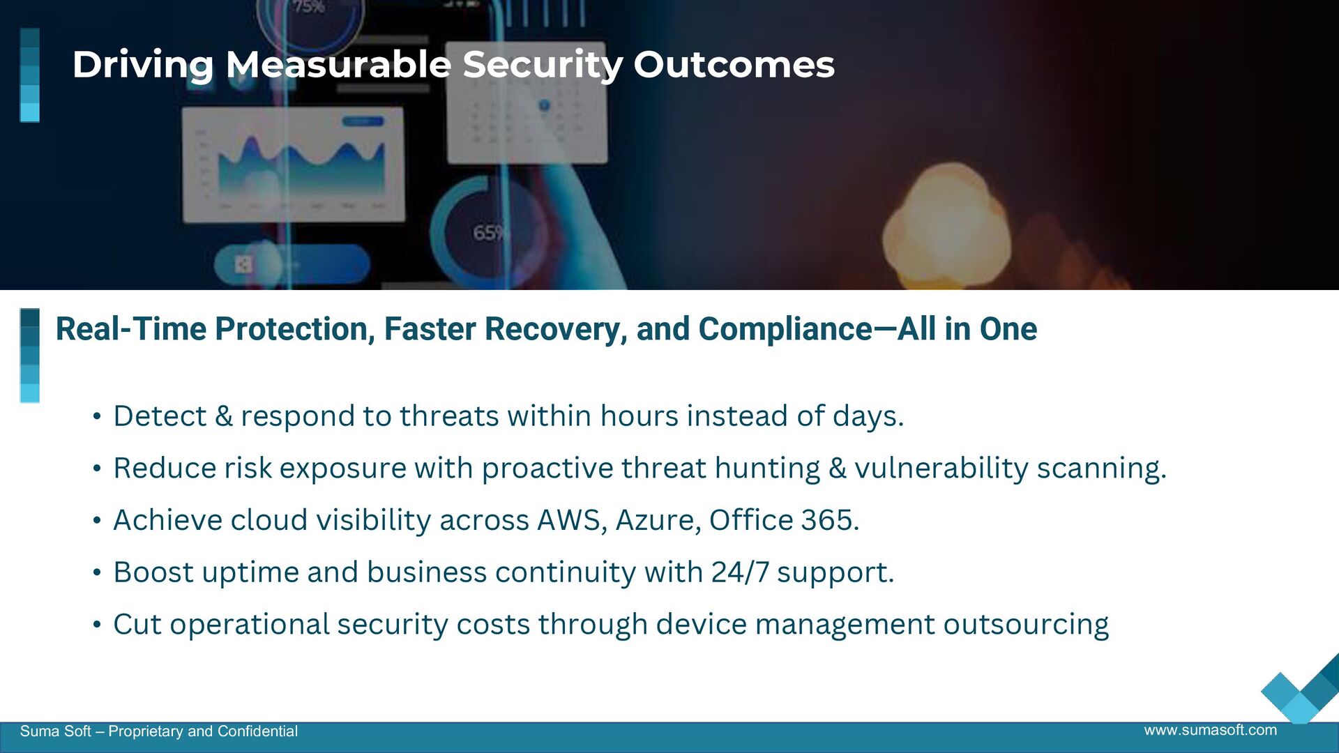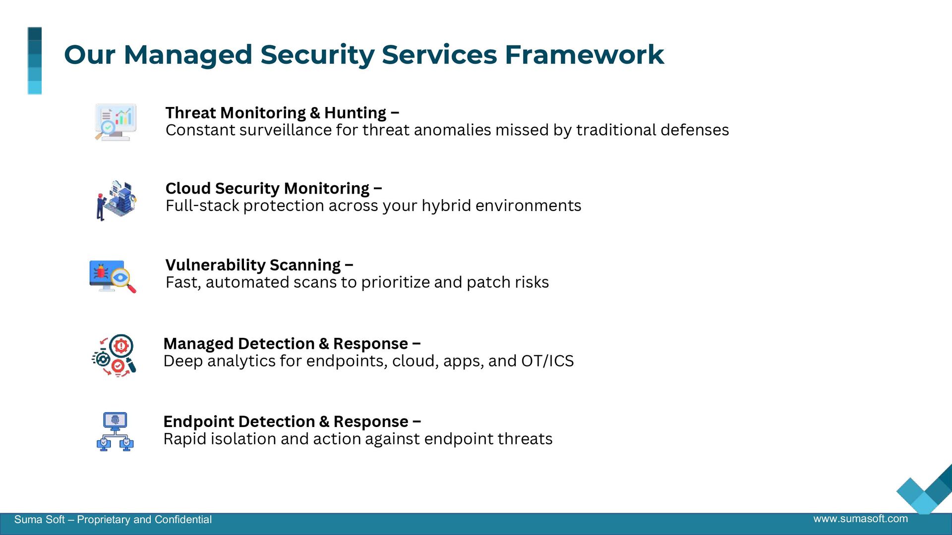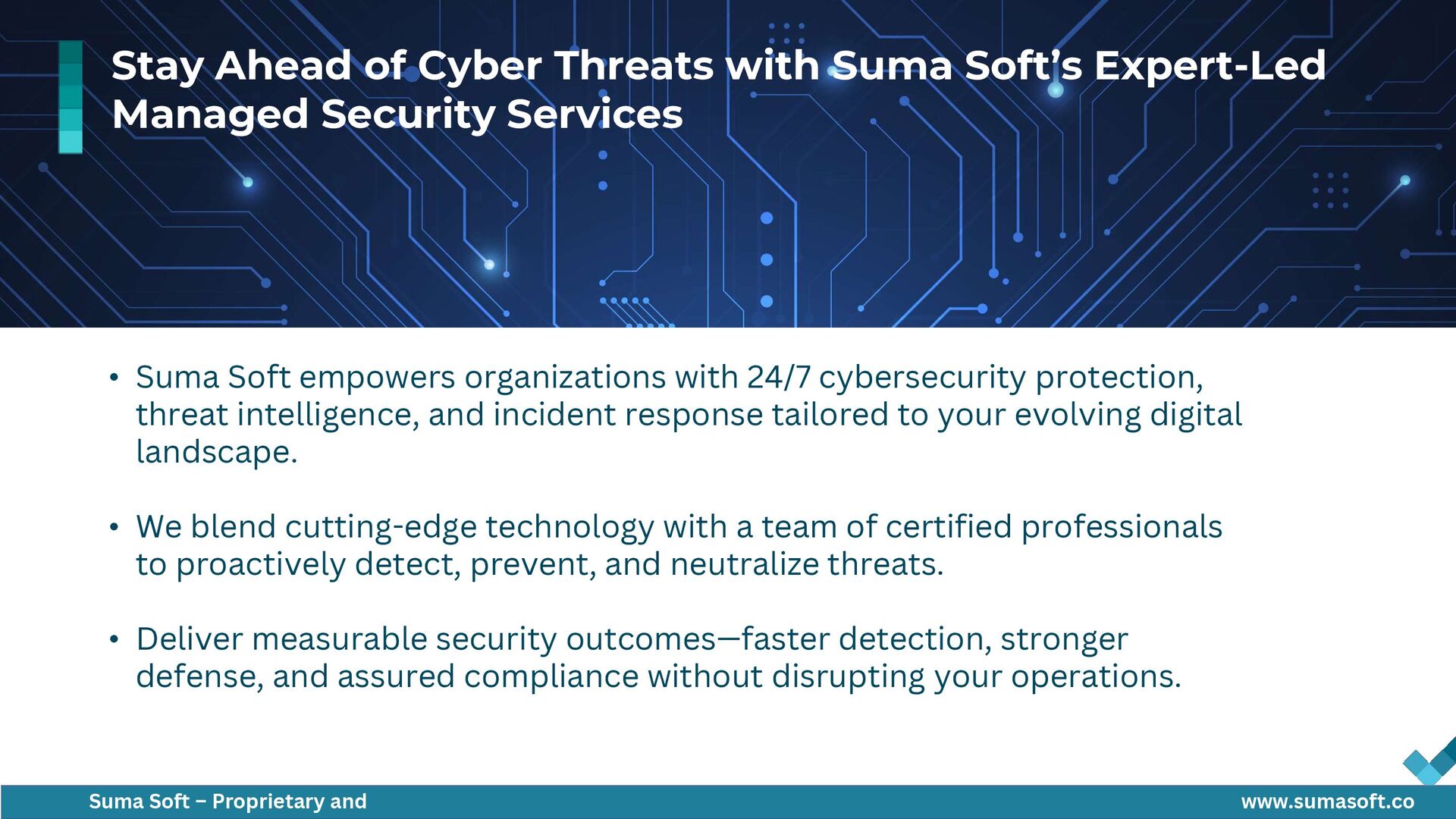 This presentation highlights Suma Soft’s Managed Security Services designed to deliver 24/7 threat detection, rapid incident response, and compliance support. It outlines a scalable security framework covering cloud, endpoints, and networks, backed by expert-led SOC operations, proactive threat hunting, and real-time remediation to help organizations stay ahead of evolving cyber risks.