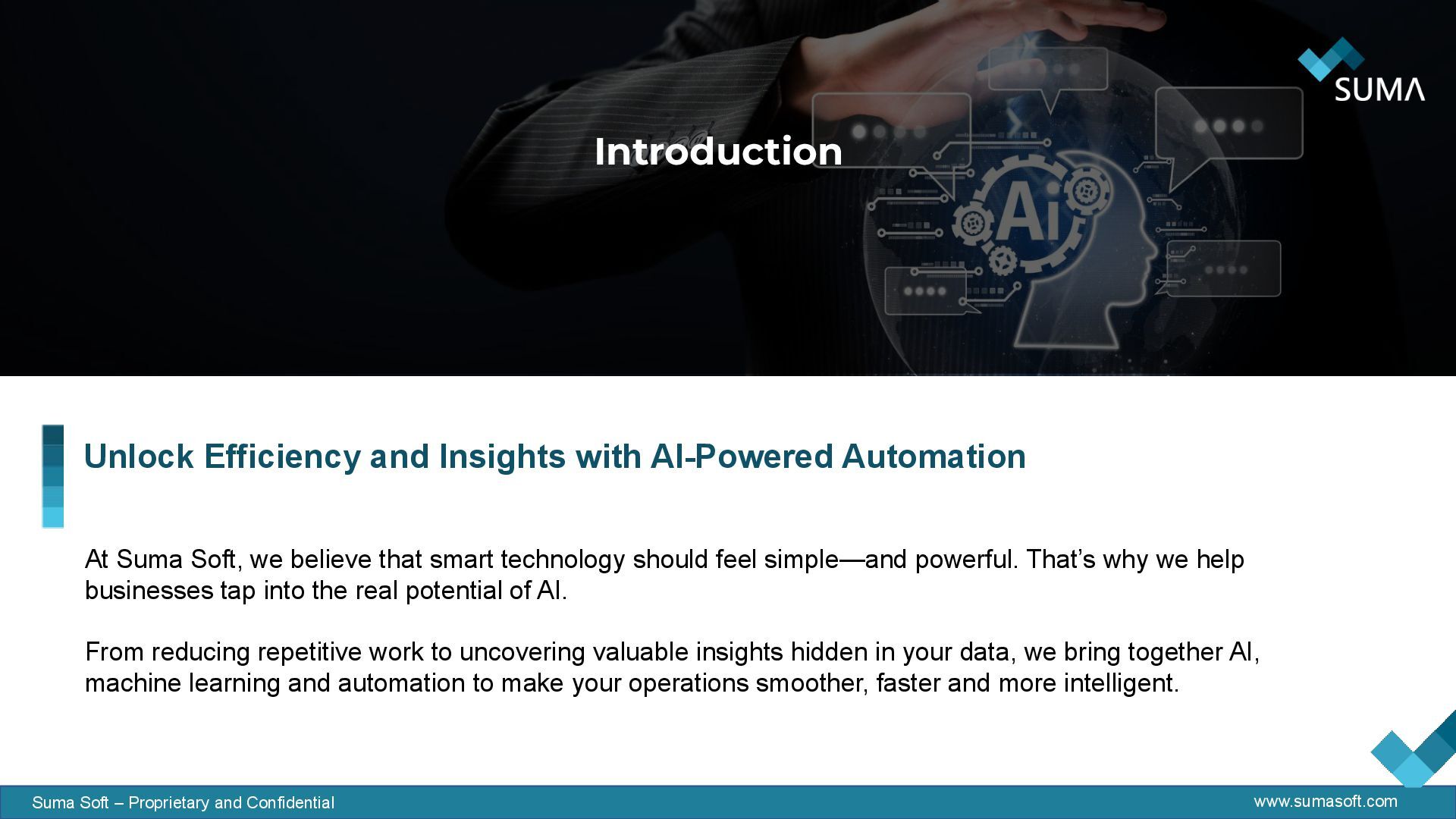 and Insights with AI-Powered Automation At Suma Soft, we believe that smart technology should feel simple—and powerful. That’s why we help businesses tap into the real potential of AI. From reducing repetitive work to uncovering valuable insights hidden in your data, we bring together AI, machine learning and automation to make your operations smoother, faster and more intelligent.