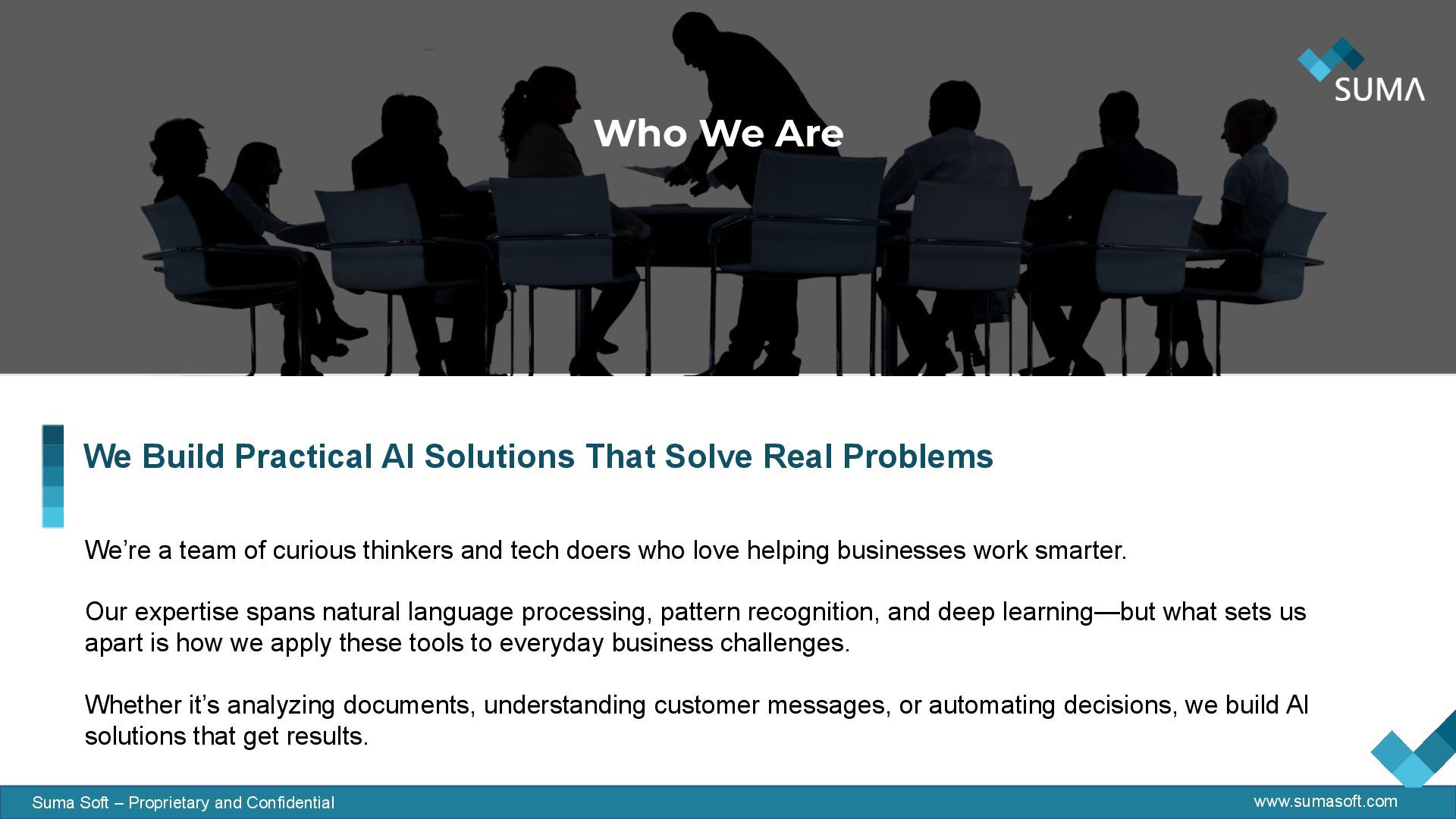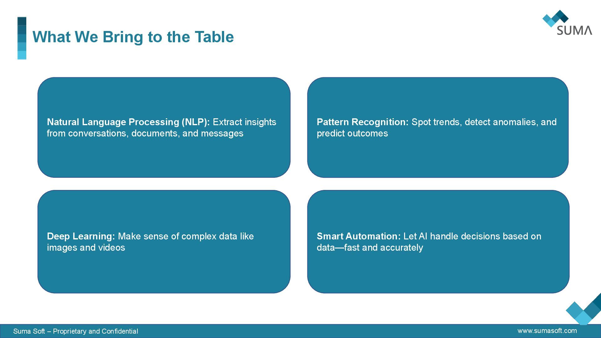Proprietary and Confidential Natural Language Processing (NLP): Extract insights from conversations, documents, and messages Pattern Recognition: Spot trends, detect anomalies, and predict outcomes Deep Learning: Make sense of complex data like images and videos Smart Automation: Let AI handle decisions based on data—fast and accurately