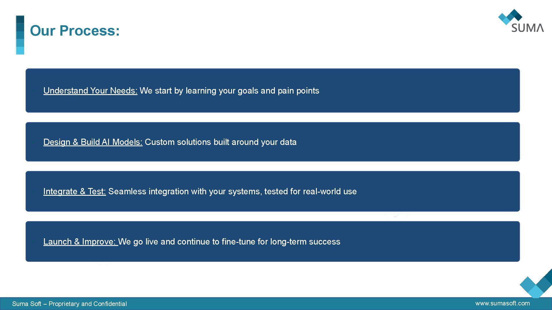 & IT Security • Design & Build AI Models: Custom solutions built around your data • Understand Your Needs: We start by learning your goals and pain points • Integrate & Test: Seamless integration with your systems, tested for real-world use • Launch & Improve: We go live and continue to fine-tune for long-term success