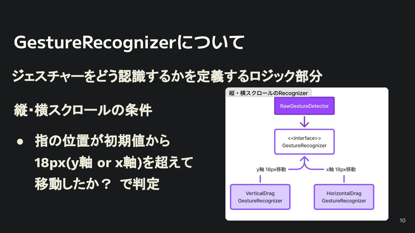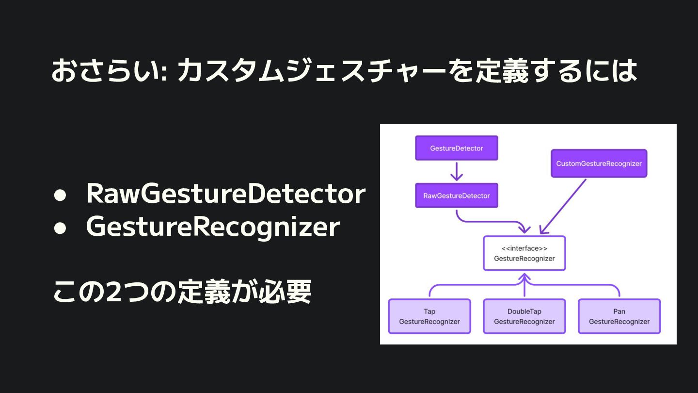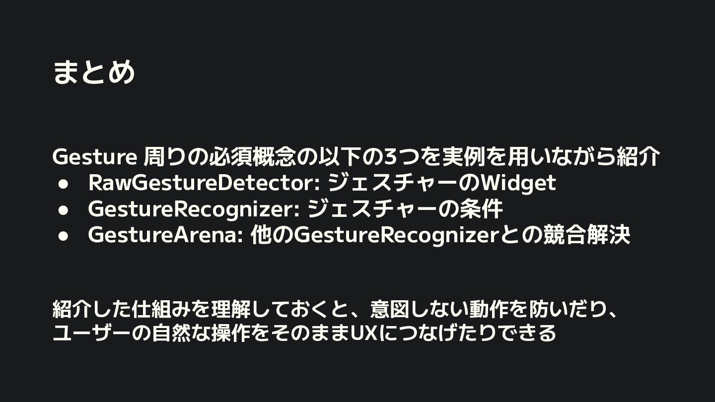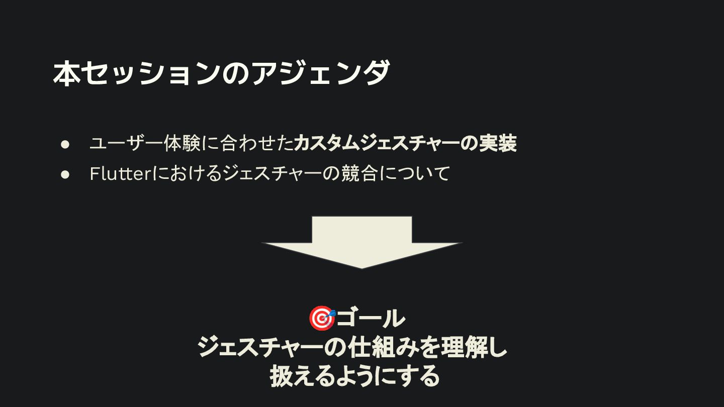 概要 Flutterの標準的なジェスチャー検出は強力ですが、特定の開発シーンでは複数のジェスチャーの競合や、ユーザー体験に合わせた独自動作の定義といった課題に直面します。 本セッションでは、こうした課題を踏まえて、Flutterアプリにおけるカスタムジェスチャーの実装例を軸に、Gestureの認識メカニズムや競合解決のアプローチなど、内部処理を含めて掘り下げて解説します。 - Flutterにおけるジェスチャー検出の基礎 - ジェスチャーの認識メカニズムと競合