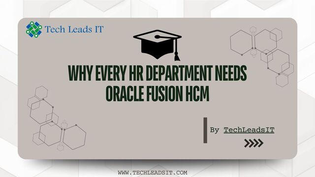 HR operations. It empowers organizations to make smarter HR decisions, enhance compliance, and improve employee satisfaction. With its cloud-based and AI-powered capabilities, Oracle Fusion HCM offers a robust solution for managing a global workforce effectively. By choosing Tech Leads IT for Oracle Fusion HCM training, you ensure your team is fully equipped to leverage these advanced capabilities and drive success. WWW.TECHLEADSIT.COM