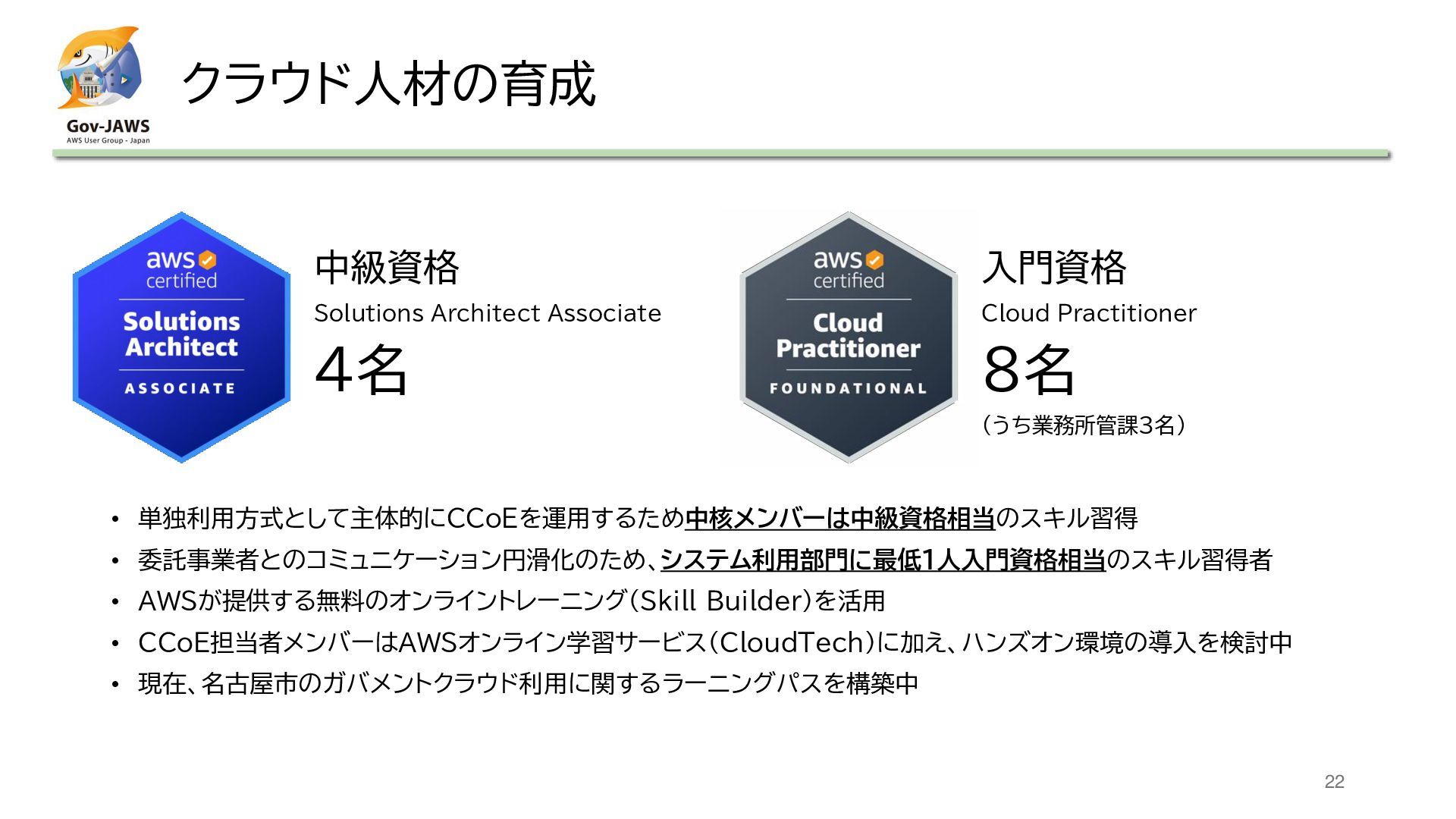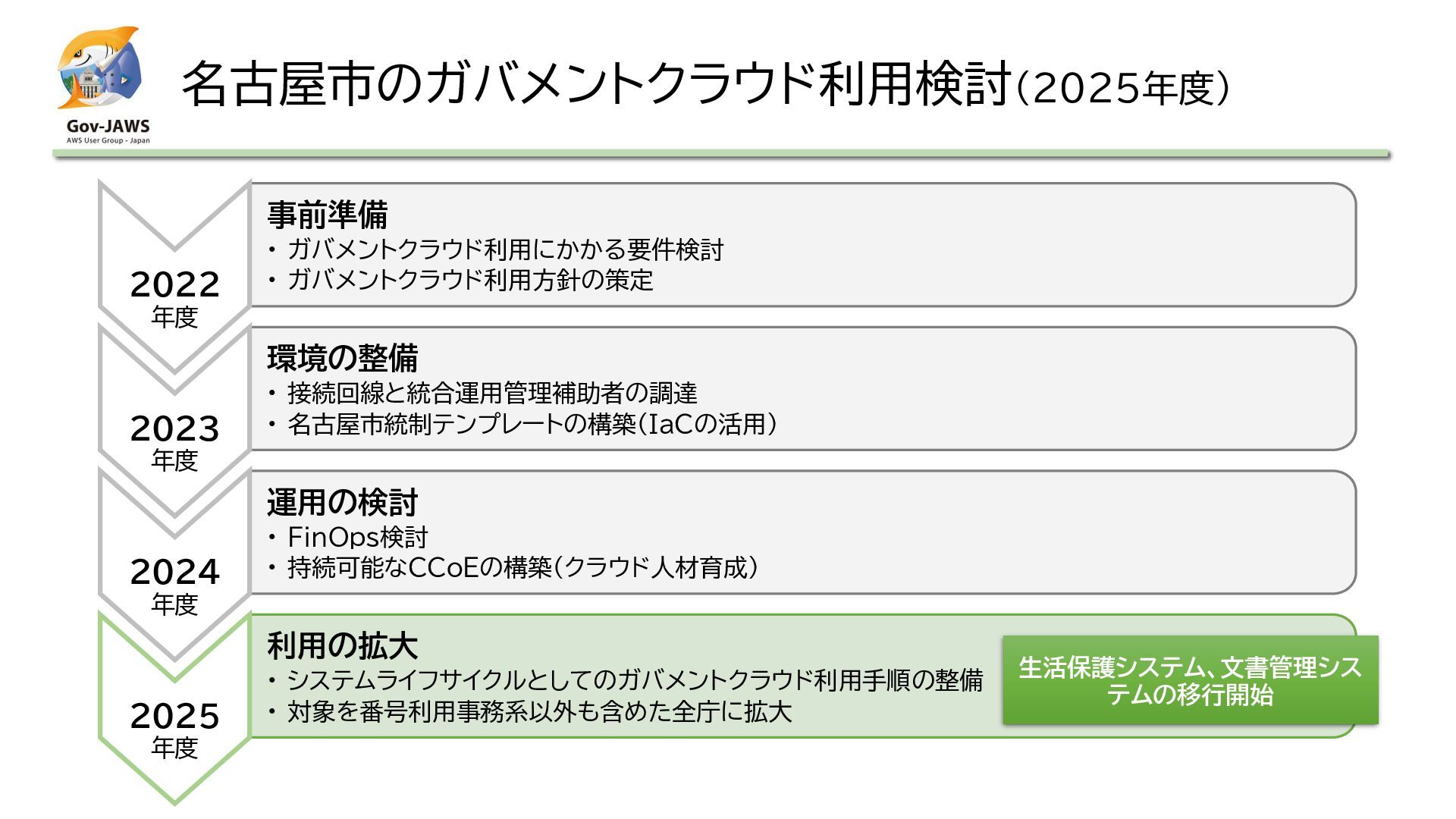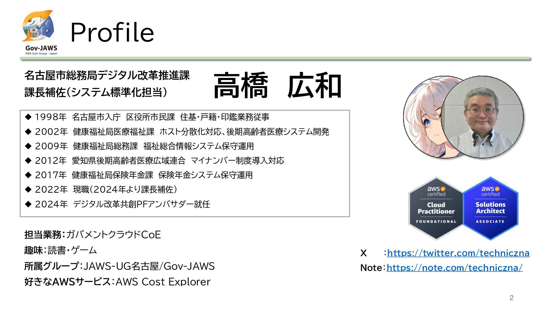 住基・戸籍・印鑑業務従事 ◆ 2002年 健康福祉局医療福祉課 ホスト分散化対応、後期高齢者医療システム開発 ◆ 2009年 健康福祉局総務課 福祉総合情報システム保守運用 ◆ 2012年 愛知県後期高齢者医療広域連合 マイナンバー制度導入対応 ◆ 2017年 健康福祉局保険年金課 保険年金システム保守運用 ◆ 2022年 現職(2024年より課長補佐) ◆ 2024年 デジタル改革共創PFアンバサダー就任 担当業務:ガバメントクラウドCoE 趣味:読書・ゲーム 所属グループ:JAWS-UG名古屋/Gov-JAWS 好きなAWSサービス:AWS Cost Explorer X :https://twitter.com/techniczna Note:https://note.com/techniczna/