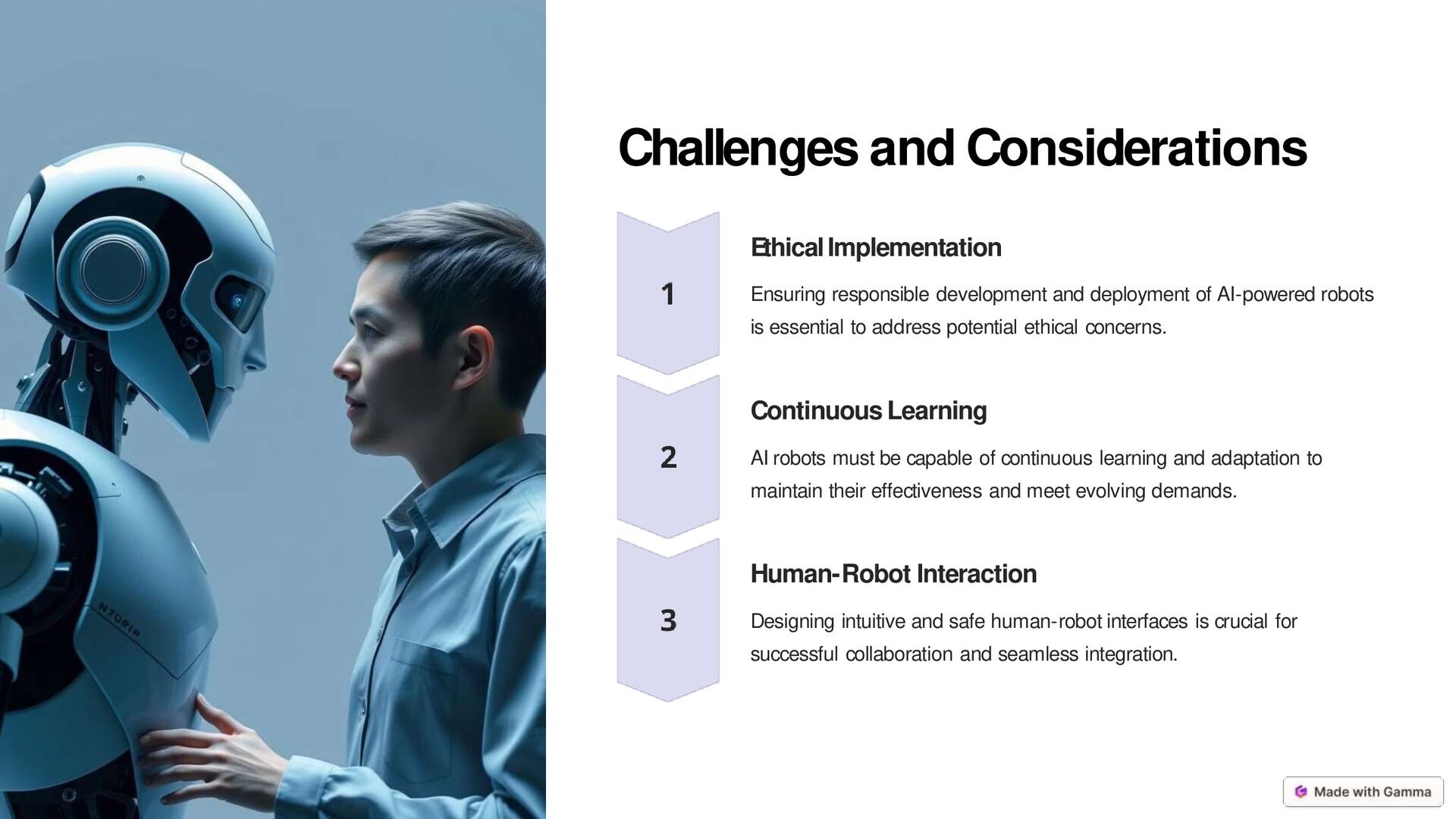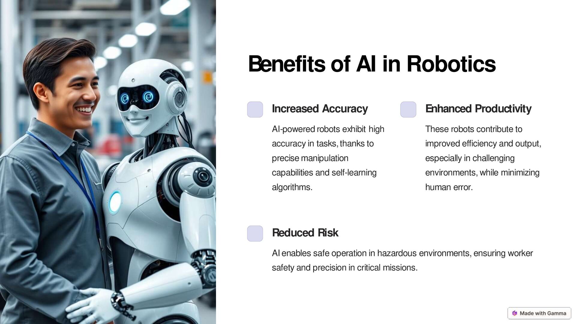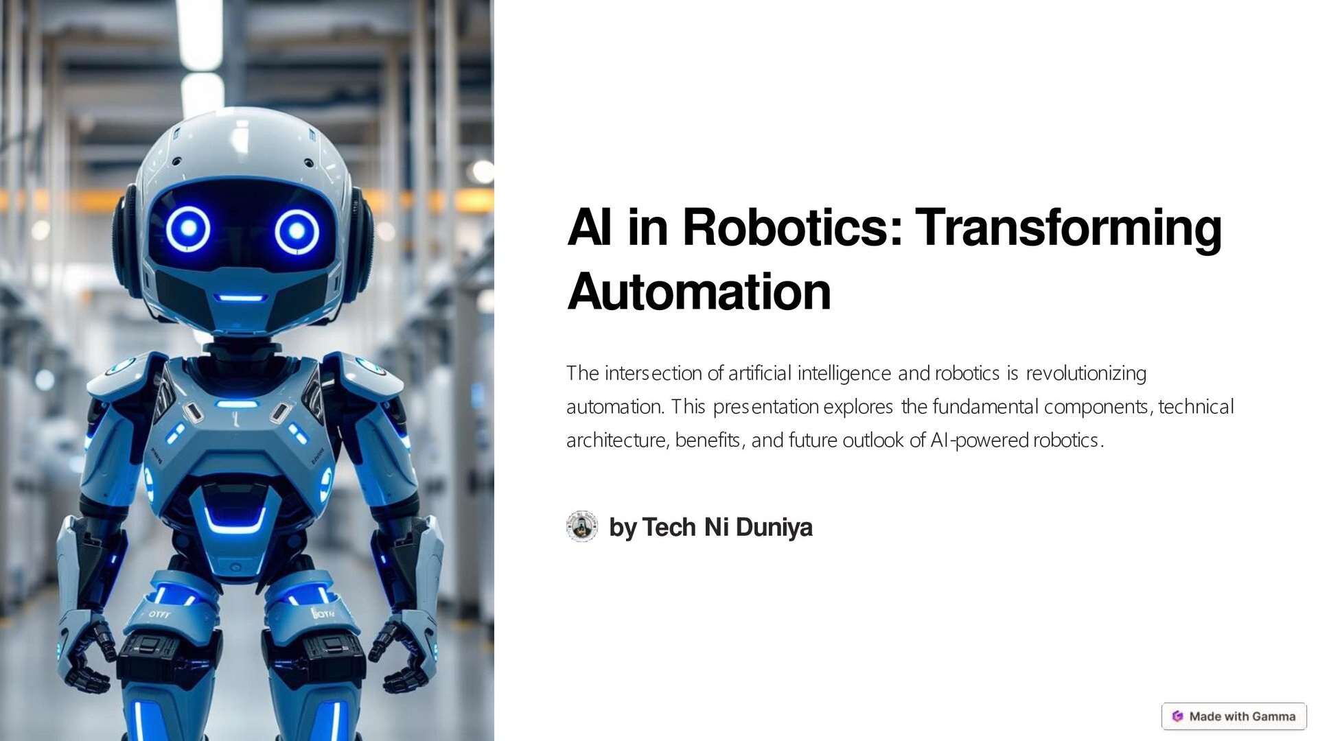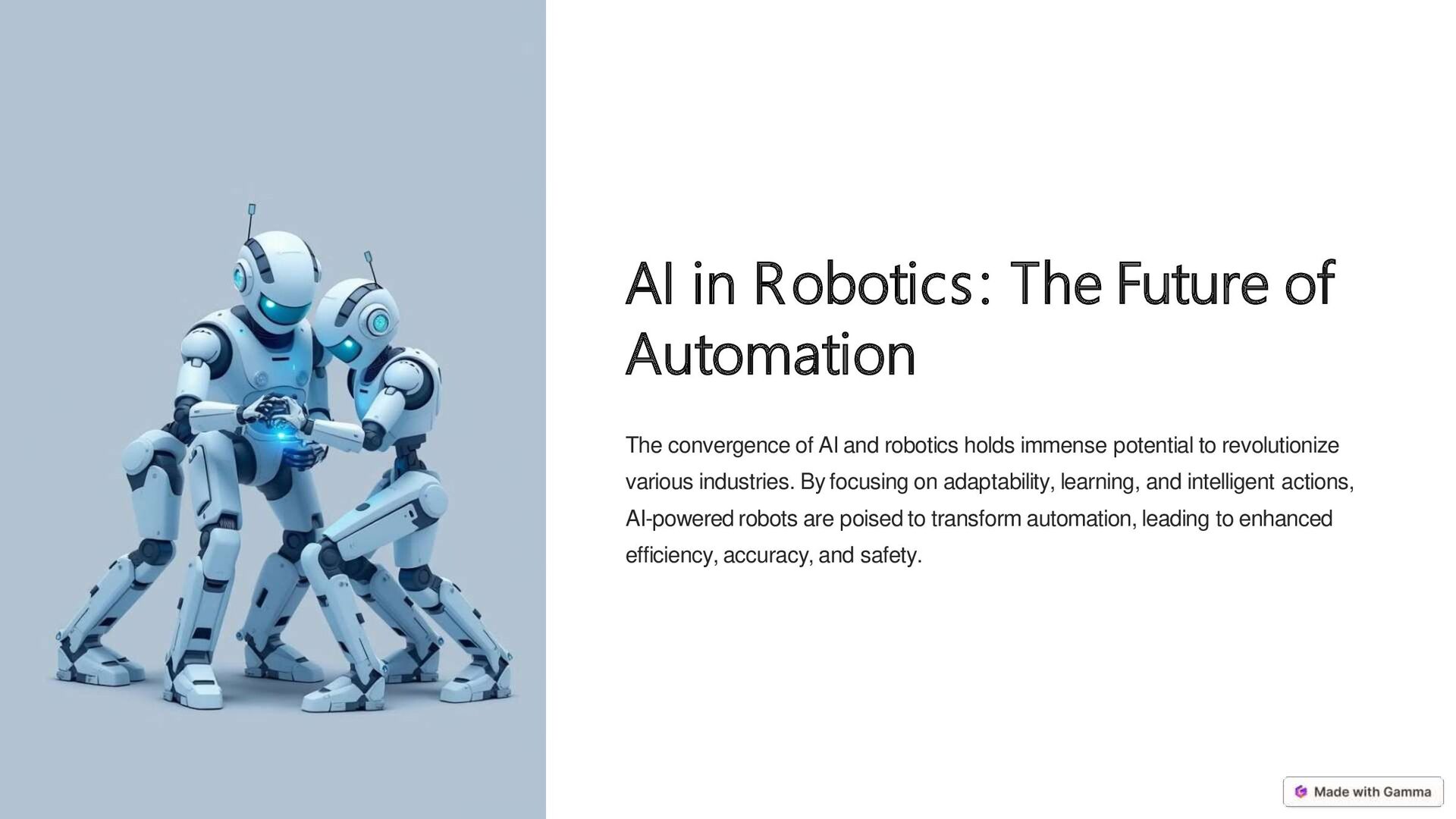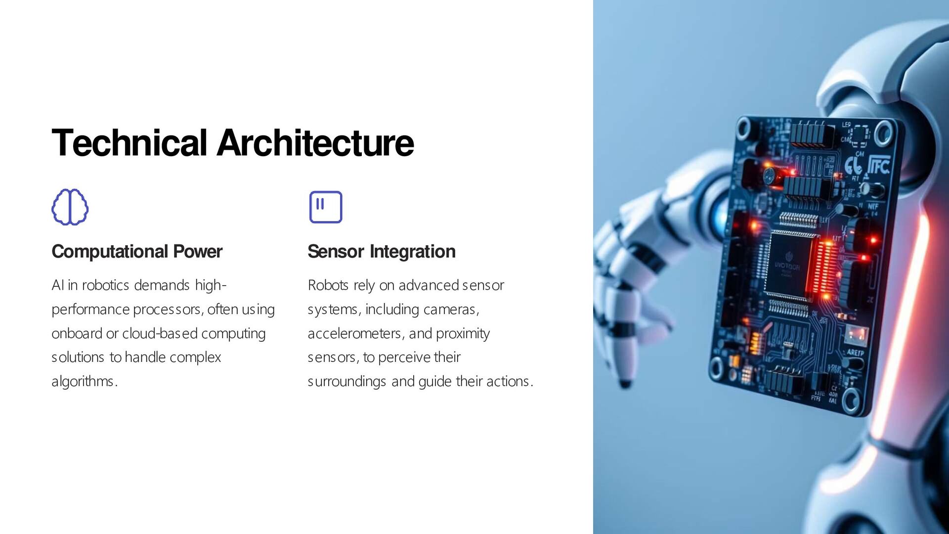 assembly lines, performing repetitive tasks with speed and precision, while adapting to changing conditions. 2 Healthcare From surgery to patient care, AI-powered robots enhance medical procedures and provide personalized assistance to patients. 3 Rescue Operations AI robots can assist in rescue efforts, navigating dangerous terrains and accessing areas inaccessible to humans. 4 Research AI robots play a crucial role in laboratory research, performing experiments, collecting data, and analyzing results. 5 Home Automation AI robots are increasingly present in homes, providing assistance with tasks like cleaning, security, and entertainment.